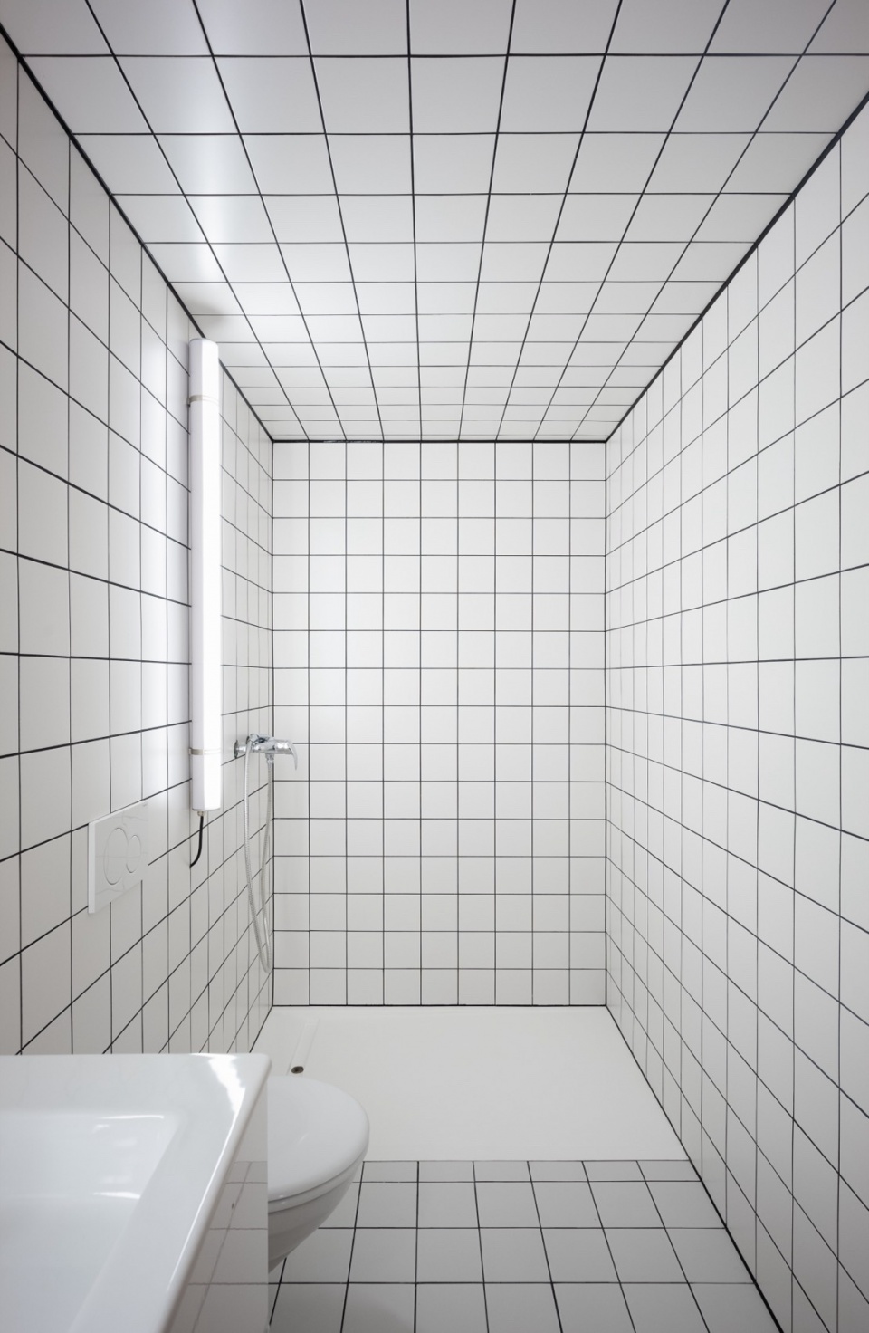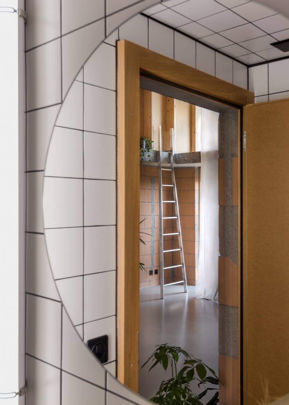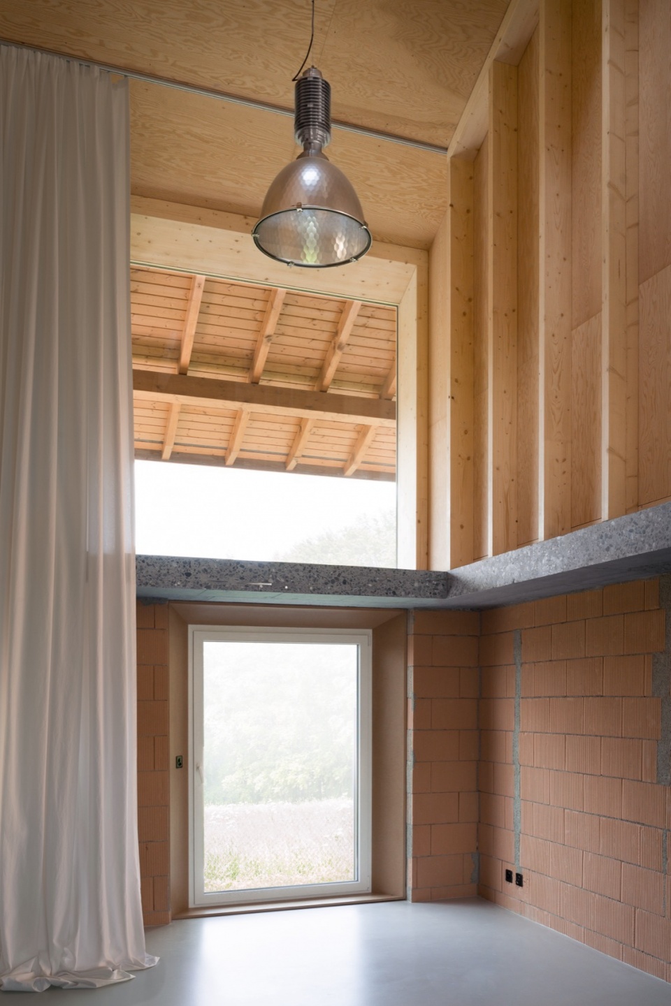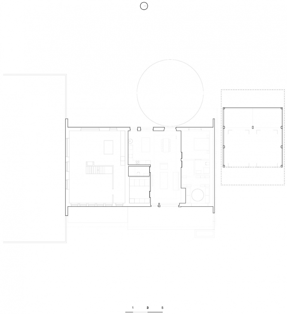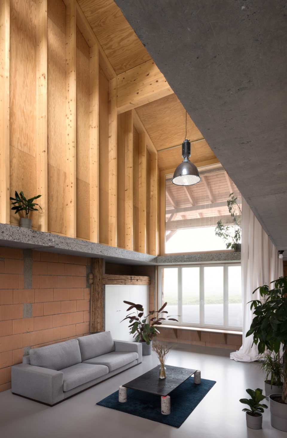 最终形成的空间布局遵循一种三分式结构:中央起居空间占据原先的 fourragère,而服务空间与卧室则布置于两侧的结构跨间之中。材料选择亦遵循相同逻辑:去除仿托斯卡纳风格的饰面,替换为令人联想到挤奶间的白色瓷砖;抹灰层被剥除,显露出下方原有的材料肌理。