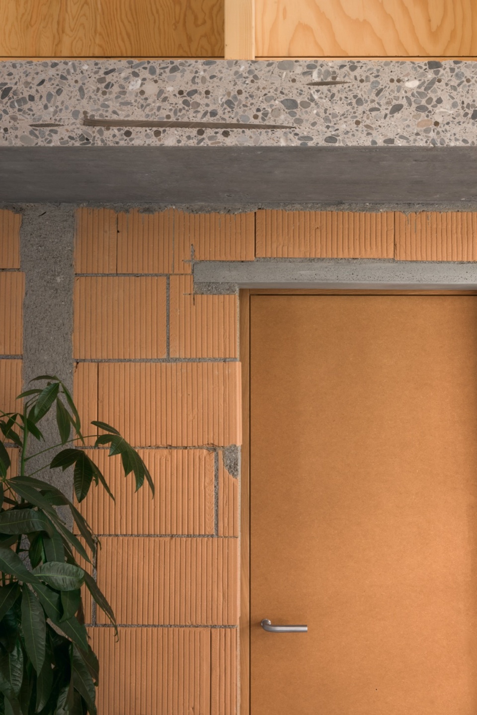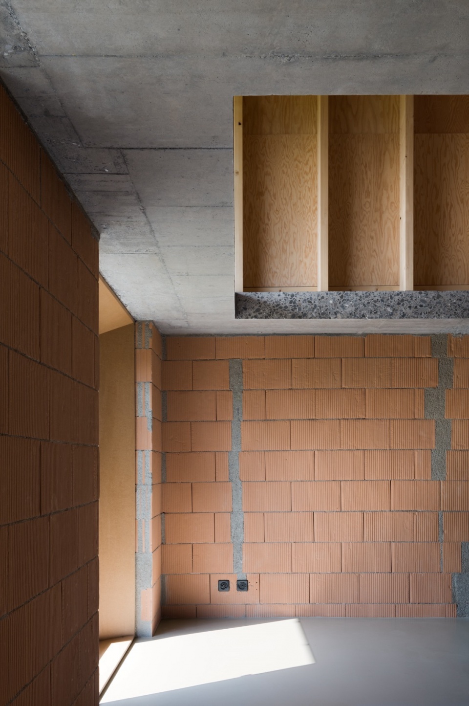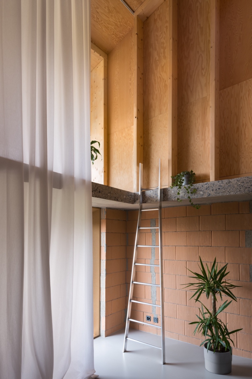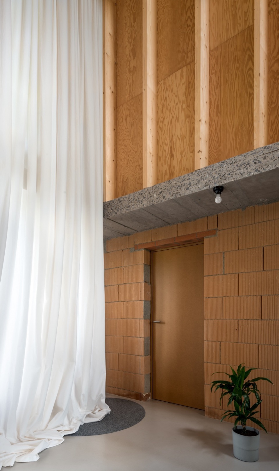 The apartment, fitted out in 2011 by previous owners, resulted from a renovation that significantly altered the rural volume’s substance and nature. The original ceiling joists were replaced with a concrete slab, the wooden structure was substituted with masonry walls, and the roof framework removed in favour of glulam beams.