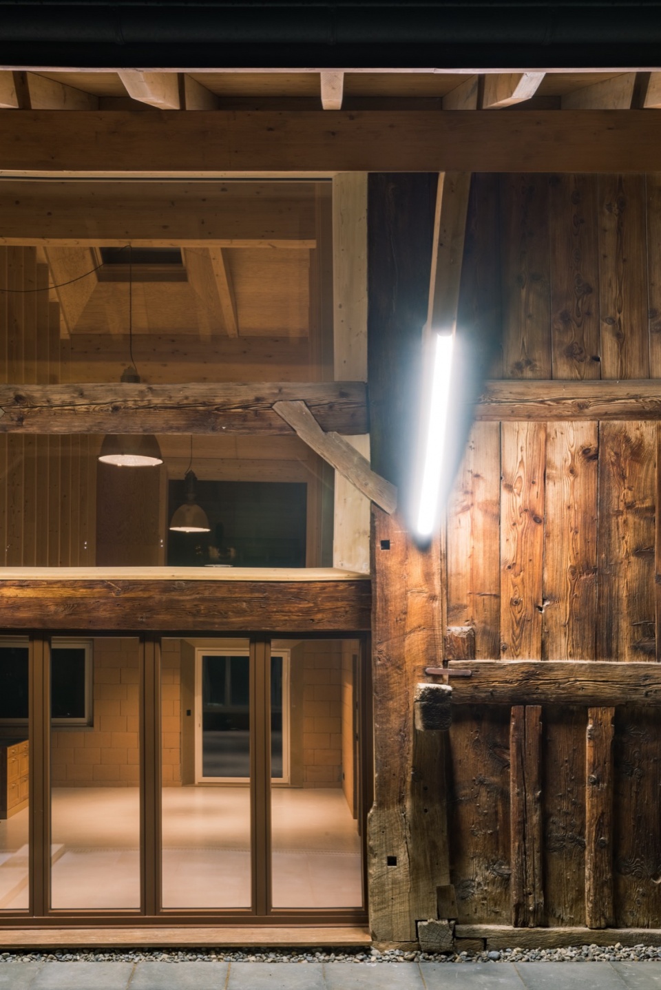 该项目涉及对一处位于18世纪农舍乡村部分内的公寓进行改造。这一时期的弗里堡农舍通常在同一屋檐下同时容纳居住空间与农业功能。乡村部分由两侧的马厩夹持一条中央通道——fourragère,这是一条用于喂养牲畜的贯通空间,同时因其较高的层高,可在马厩上方储存干草。