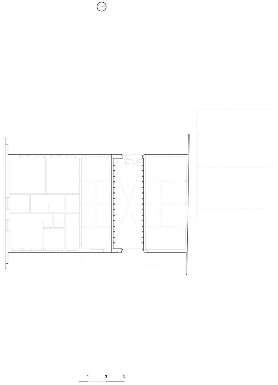 本次项目以一种“再”转化的形式介入谷仓,通过减法策略,重新显露空间的原始品质。主要干预在于恢复fourragère原有的空间特征:拆除后期设置的隔墙,以重建其贯通式空间形态;同时对楼板进行全厚度切割,使其垂直向度得以恢复。