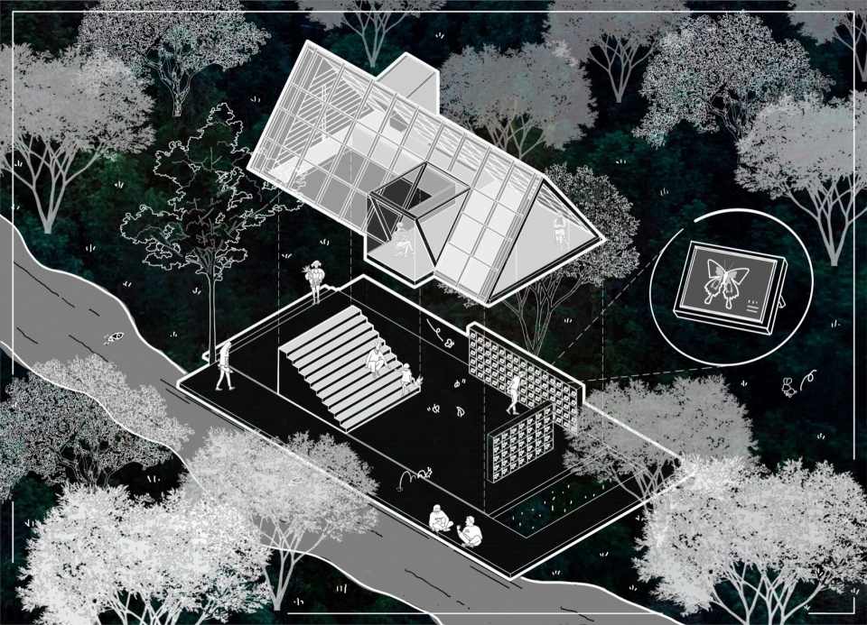 Dance of Structure: Rejecting enclosed box-like forms, we adopted a lightweight triangular geometry for the library’s roof structure. Like gently vibrating butterfly wings, this sharp yet soft form provides necessary shelter and spatial definition while minimizing its volumetric presence, allowing the building to “cling” or “float” gracefully among the streamside trees like a native plant.