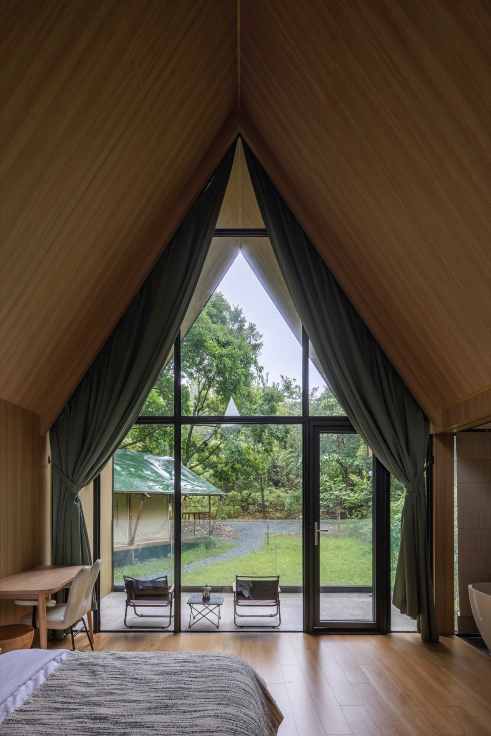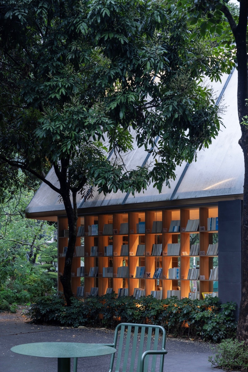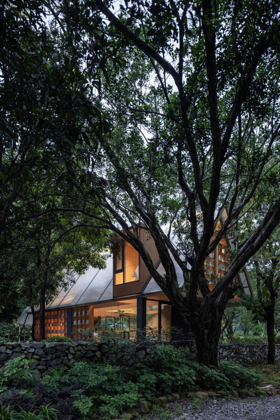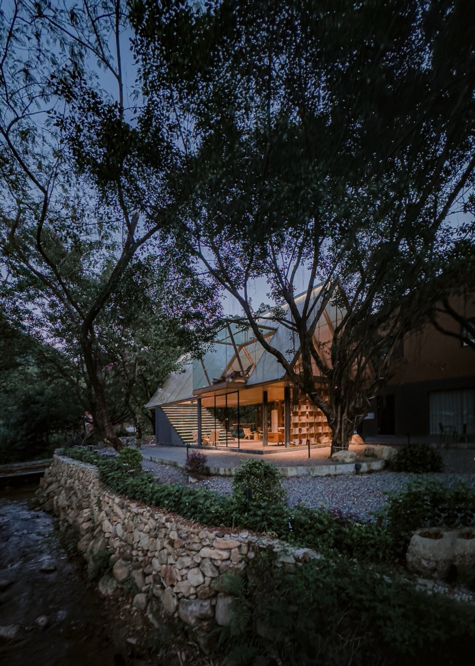 结构之舞:摒弃封闭箱体,采用轻盈的三角几何形态作为书屋顶盖结构。如同微微振动的蝶翼,这种锐利却不失柔和的形态,既提供了必要的遮蔽与空间感,又最大限度减少了体量感,令建筑如林间原生植物般,以优美的姿态“攀附”或“飘落”于溪畔树影之中。