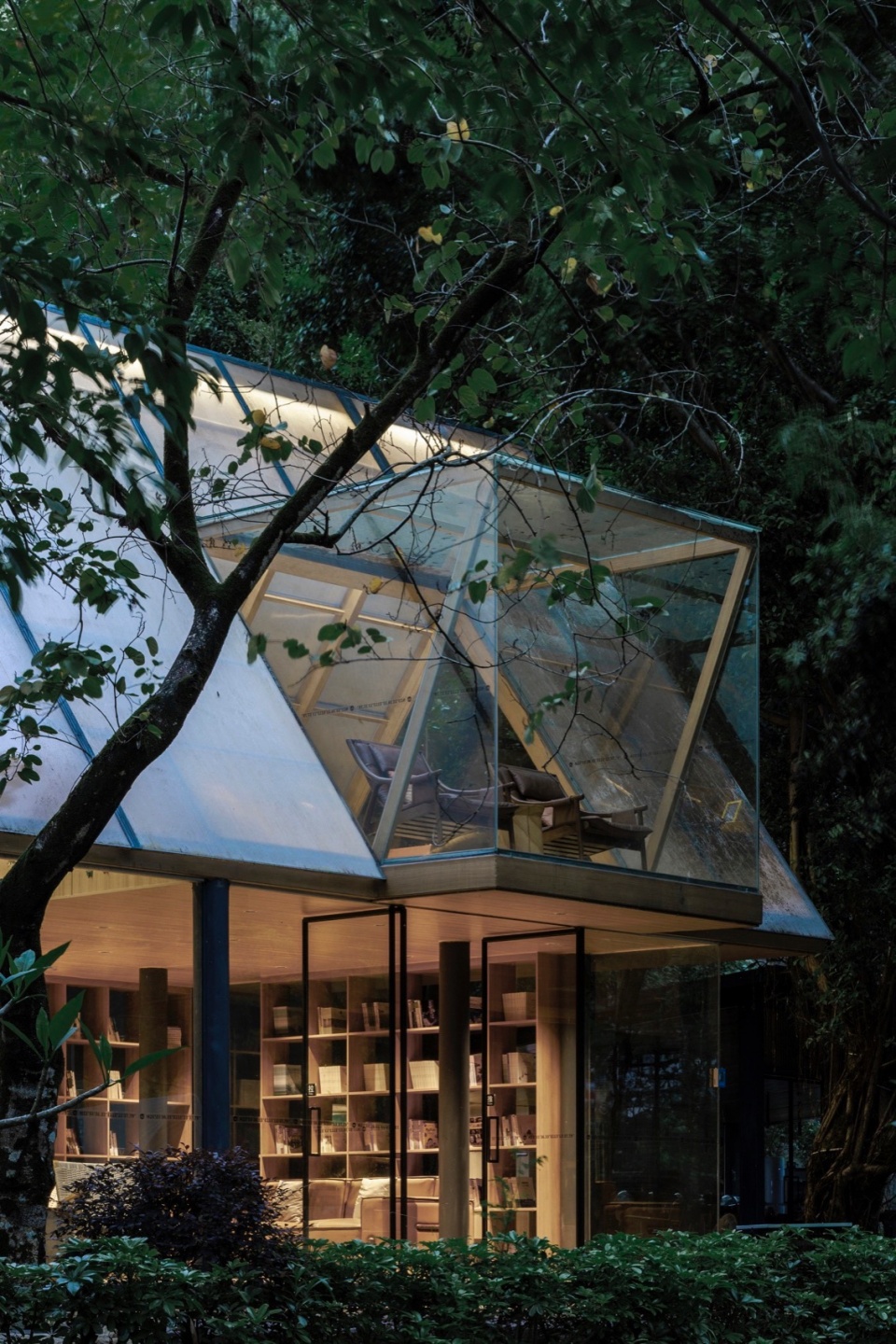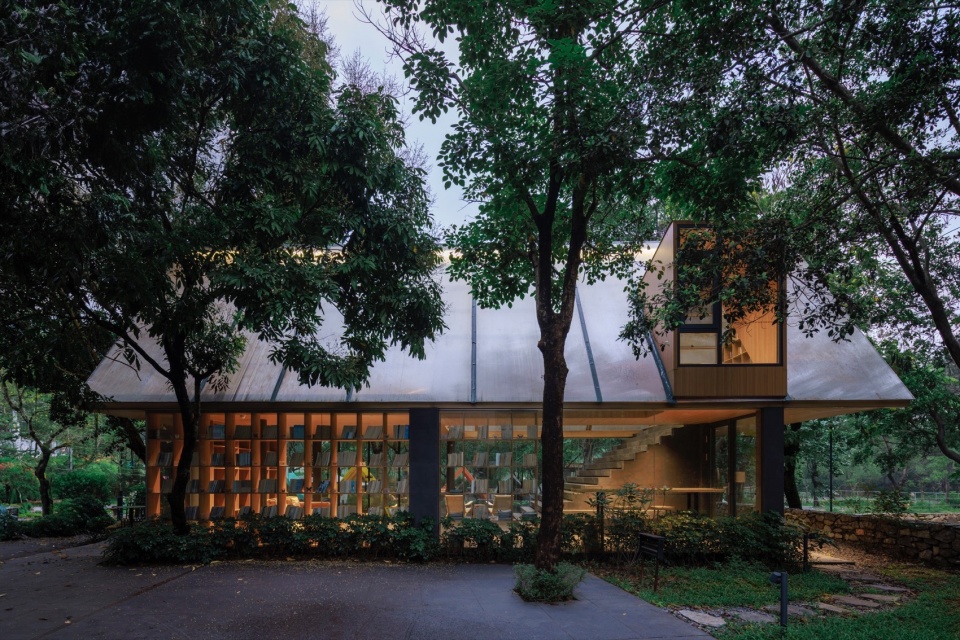 The Butterfly Forest · Diesen Library aims to break through traditional resort ancillary functions, composing a solidified landscape poem in Huadu’s Prince Mountain Butterfly Valley. With its extremely light triangular posture, hazy interfaces of polycarbonate panels, and thoroughly open, boundaryless space, it humbly nestles within nature’s embrace. Here, architecture is no longer a solid object but a breathing field, a vessel capturing light and shadow, a catalyst for butterfly dreams.