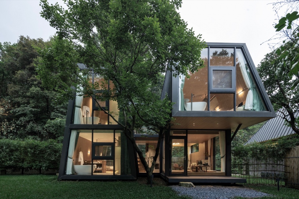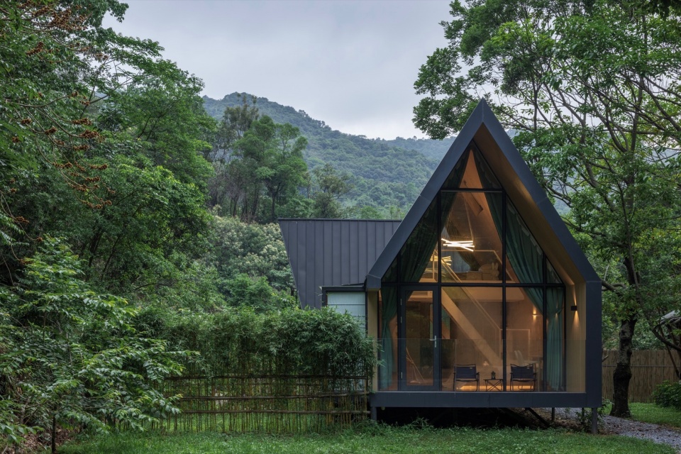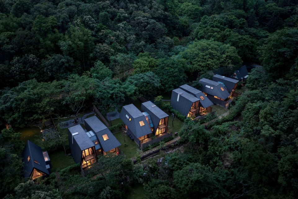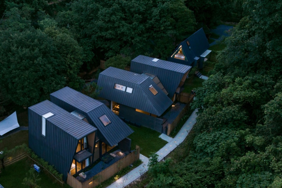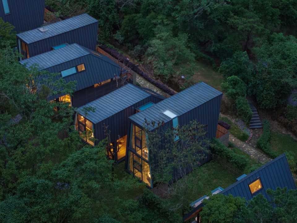 如果说蝶森书馆是山林序曲与灵感驿站,那么这片深藏于葱郁森林环抱中的栖居之所,则是疲惫灵魂真正得以卸下尘嚣、沉浸于山野律动的 “归巢之地”。我们,在此延续了其“野生叙事,诗性几何”的设计哲学,将一组现代而克制的体量,如墨色轻羽般温柔地安放于连绵的深绿之中。
