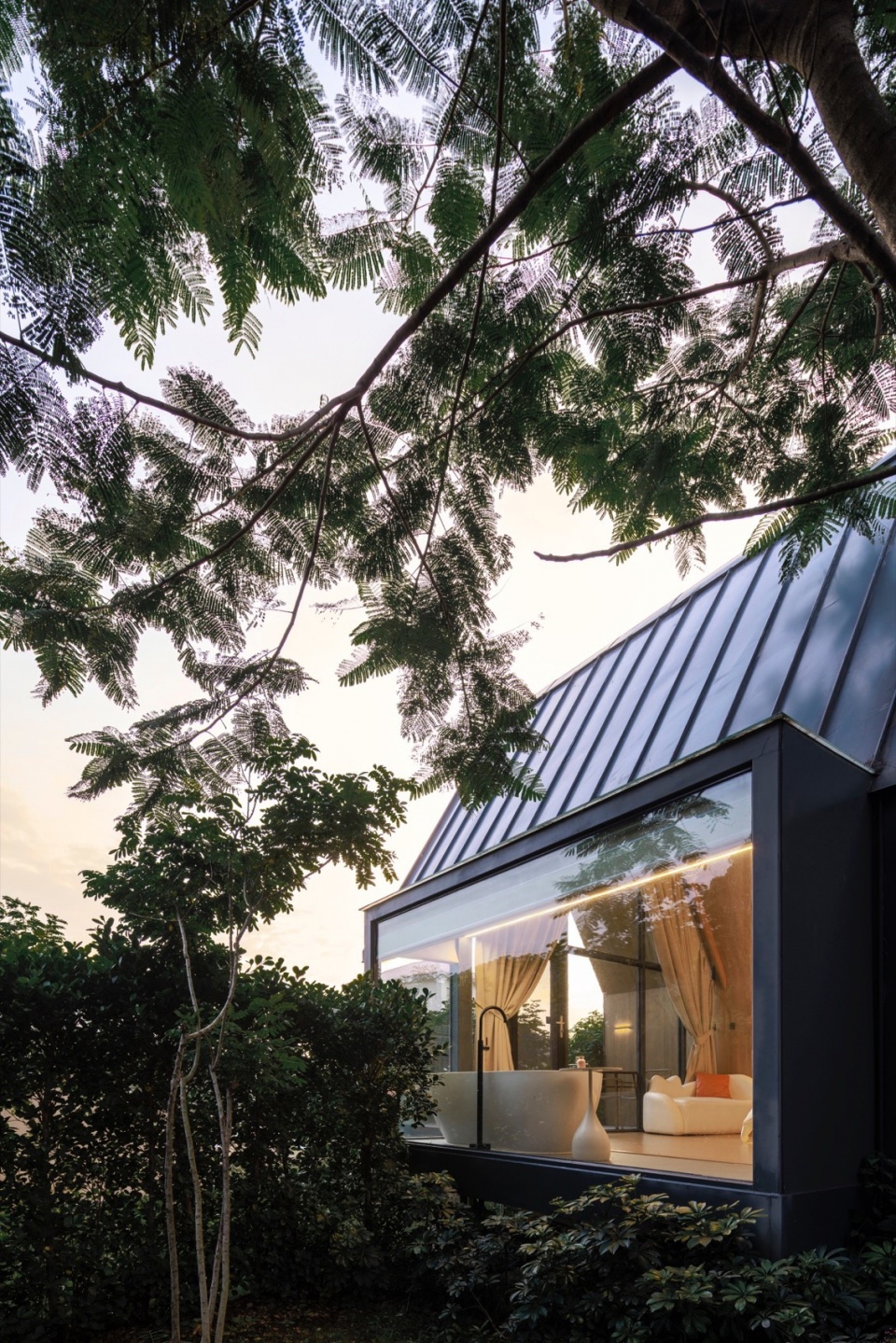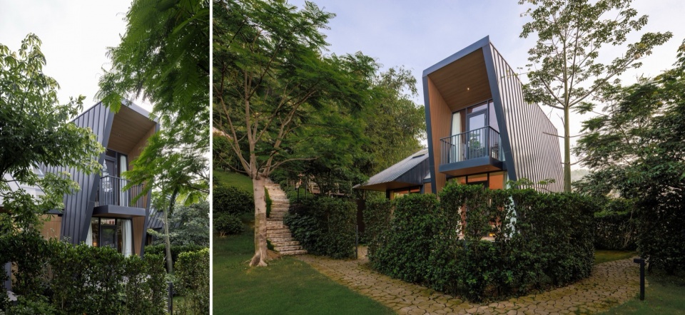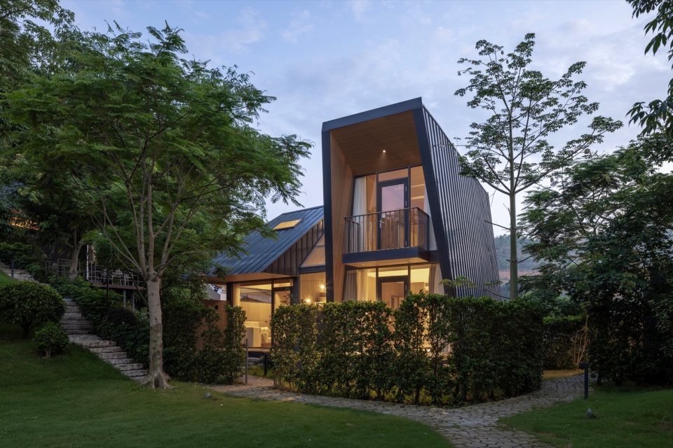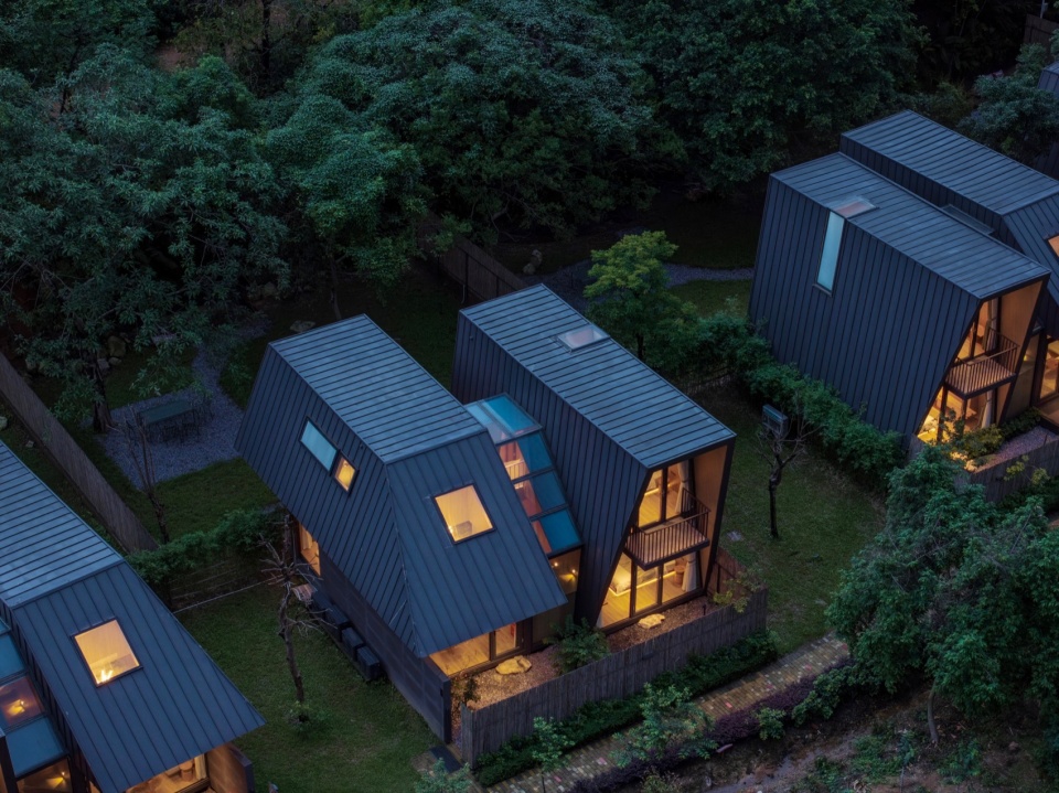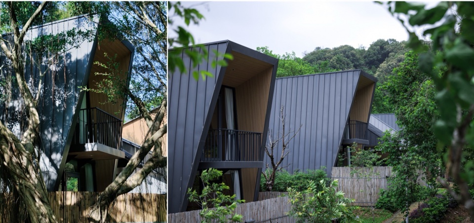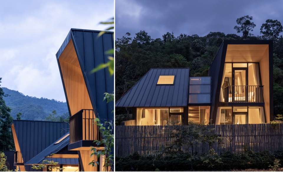 The guest room architecture is also a practice of “Wild Narrative” geometry. Restrained Volume, Geometric Edges: The buildings exhibit a deep metallic tone, with simple and restrained volumes, showcasing clean, sharp geometric edges. The roof lines are clear and gentle, stripped of all unnecessary decoration.