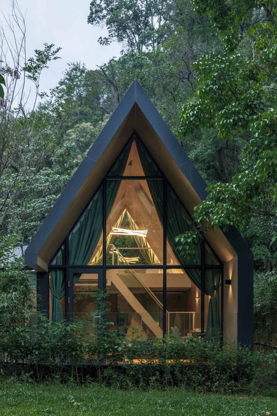However, when night falls, the warm internal lighting emanates through the windows and skylights. Then, the dark “inkwell box” becomes an exquisite picture frame, setting the staged drama of indoor warmth and lived-in atmosphere against the deep ink-green forest backdrop.
