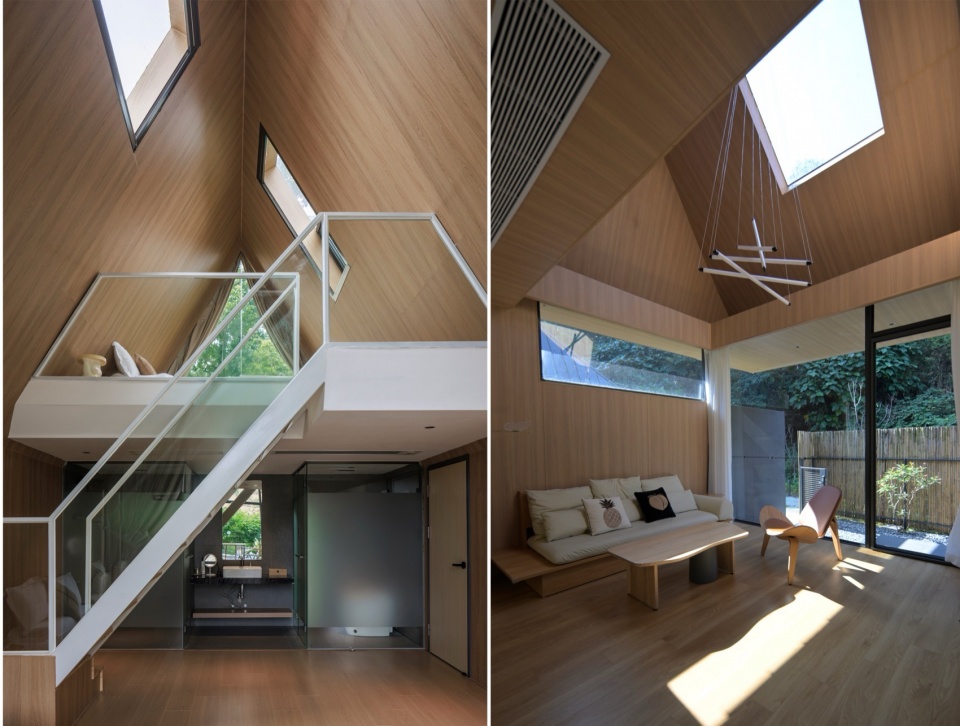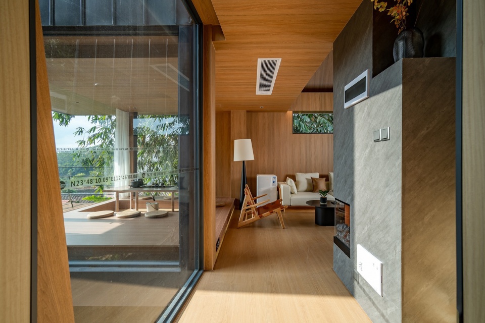 洞见森林,自然感知:通过对窗的位置与空间形态的研究,通过不同的侧面开窗形式与自然产生微妙的对话关系,破口而出的窗洞,看向树冠与天空,在室内雕刻出不同时刻光影变化,居住在室内获得更多自然的感知。