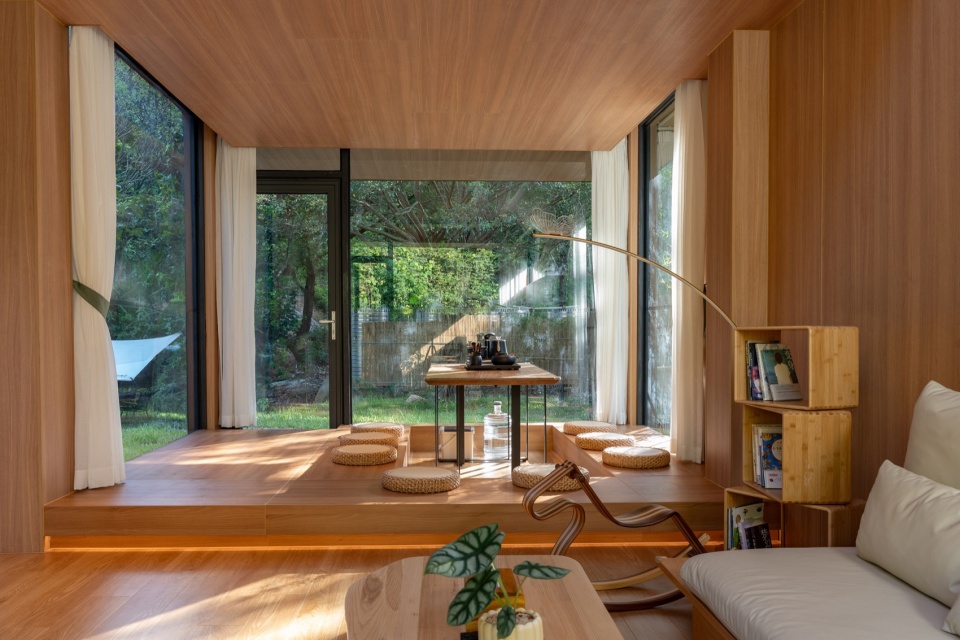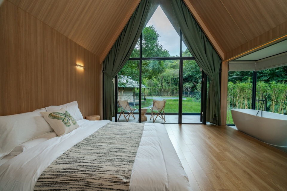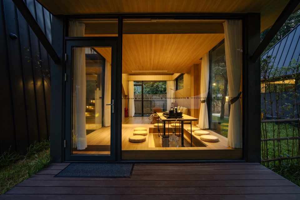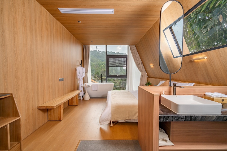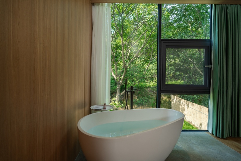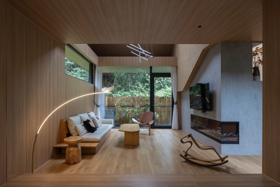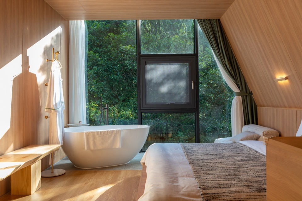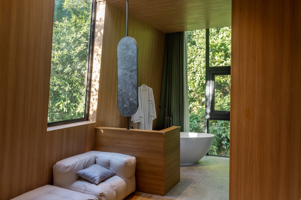 山水栖居,森林诗篇:公区的客厅与茶室与前后庭院互相贯通,落地窗将室外的山体树木和溪流景色引入室内。客房前后通透,最大化将自然景观引入室内,阳台推门而出就是茂盛的树林。