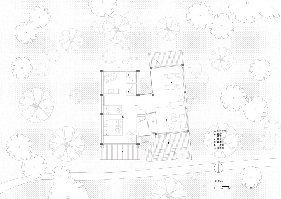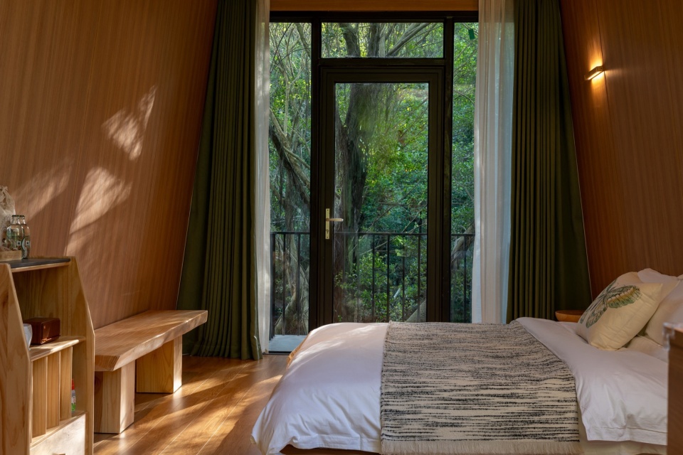 有机散落:客房的排布摒弃了僵硬的阵列,呈现出一种有机而有序的“散落”姿态。它们依据地形、植被间隙自然错落,彼此保持恰当的距离感,既保证了每栋客房的私密性与专属感,又让每扇窗外都是一幅由枝叶编织的、独一无二的森林画卷。这种布局模拟了森林自身的生长逻辑,秩序源于尊重。