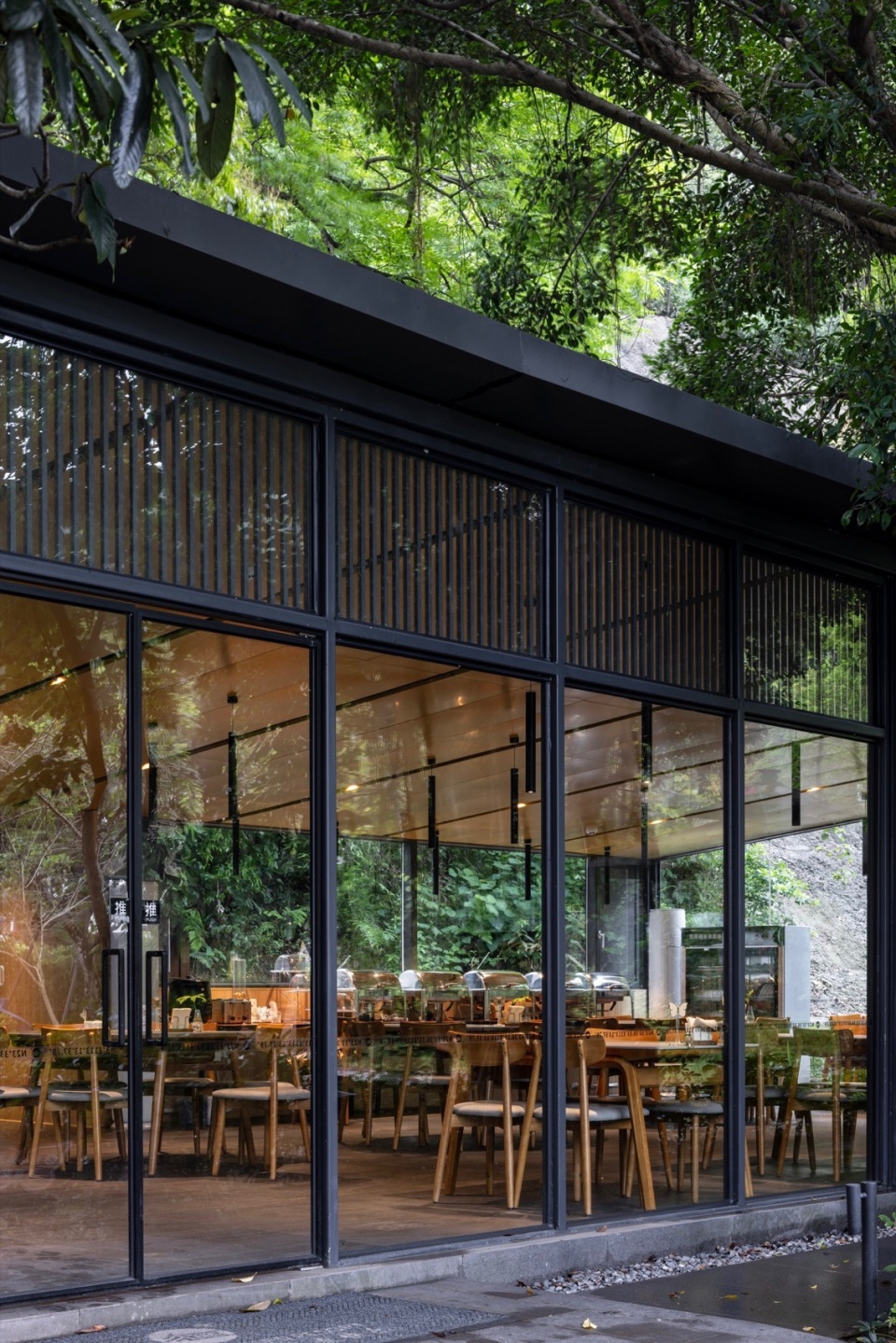 Transparent Volumes Hidden in the Woods: using black frames as its brush, invites the greenery to join the table, constructing a “wild-dining pavilion” that breathes. The building’s black structural framework creates a sense of order. Large areas of glass minimize the building’s volume, turning the restaurant into a crystalline transparent entity. This too is “Wild Narrative”—a restrained poetics applied to the façade.