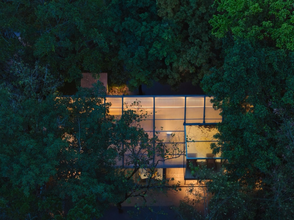 然而,当夜幕降临,建筑内部的温暖灯光透过窗户、天窗散发出来。此时,深色的“墨匣”成为了精致的画框,将室内的温馨与生活气息化作舞台剧,镶嵌在深邃的墨绿森林背景之上。