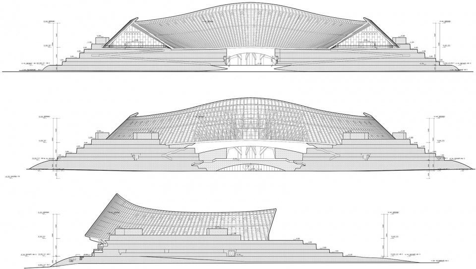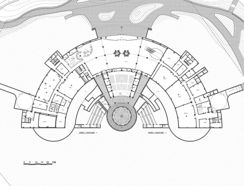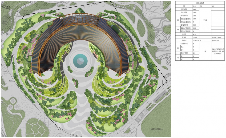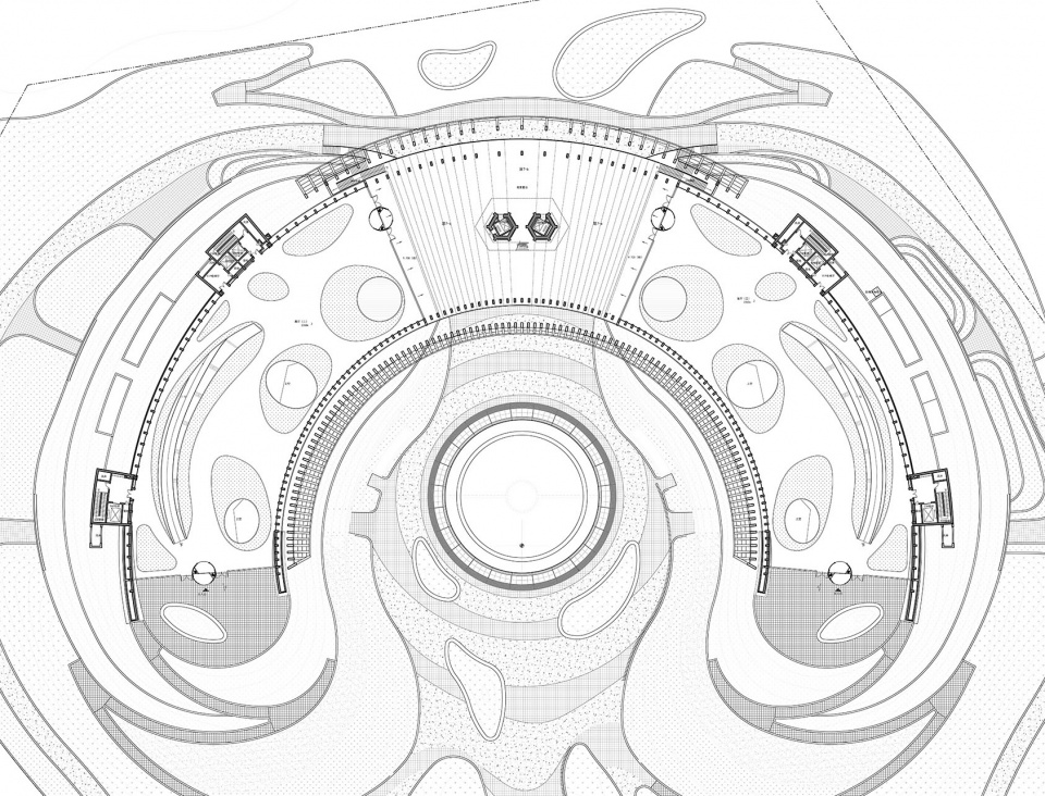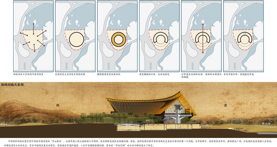 The site relationship is different from the “back mountain face water” of traditional Chinese architecture. Tourists enter the pavilion from the south side, while the north side is the largest lake in the park. Therefore, the first question is how to deal with this contradictory site relationship. The design considers the plan of the building as a half-ring, forming an entry plaza on the south side; In order to solve the relationship between the building and the water, the middle part of the ground floor is overhead, forming a corridor that runs through the north and south, and people can directly look through it. The original “backwater space” has a wonderful connection with water. Another ingenious aspect of the site design is that – design with the north-south height difference, people can be directly outside from different elevations. The elevation of the site within the red line is between 484.80-483.80, and the south part is higher than the north part. The elevation of the bank of the lake in the north is 478.00, which is about 6 meters high. According to the design of the single streamline of the exhibition hall, combined with the basement setting, the consideration of the amount of excavation is reduced. From the south side of the red line to the main entrance of the building, the elevation of the ground is gradually raised by 4 meters, and the elevation of the main entrance (±0.000) is 488.30. The exit level of the north side of the basement is -6.000, and the absolute elevation is 482.30, thus realizing the site design strategy of “entrance and exit in different elevation.”