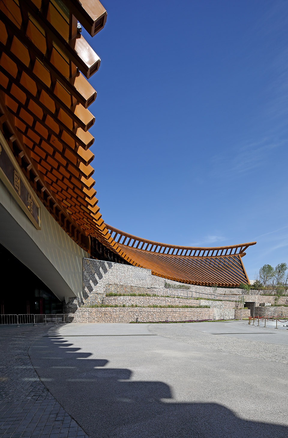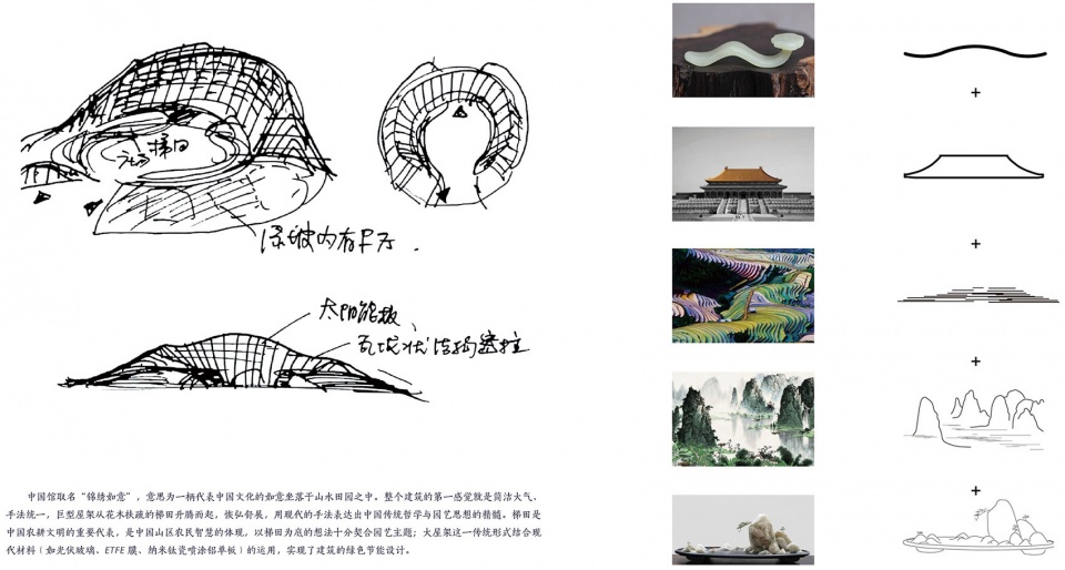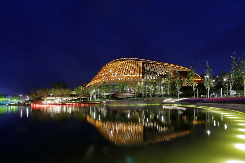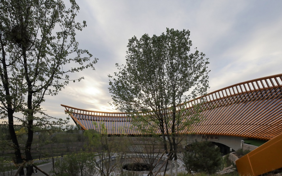 中国馆位于世园会核心景观区山水园艺轴的终点,是世园会最重要的建筑之一,其南侧为山水园艺轴的起点——园区1号门,北侧为妫汭湖,西侧为永宁阁,东侧为中华园艺展示区。中国馆仿佛一柄如意坐落在山水田园之中,它结合了本土的园艺智慧,体现了悠久的中华农耕文明,讲述了人与自然的美丽故事,采用符合本土理念的材料及适用技术,最终成为一座有生命、会呼吸的绿色建筑。