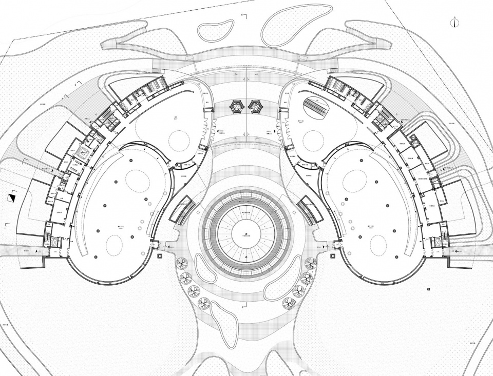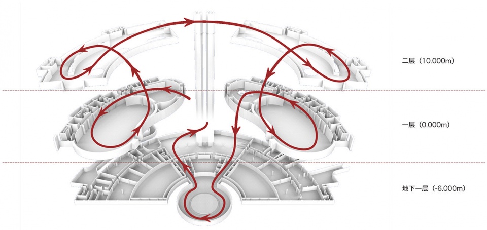 建筑的场地关系不同于中国传统建筑的“背山面水”——游客从南侧进入场馆,而北侧是园区最大的水面妫汭湖,因此,如何处理这种矛盾的场地关系是建筑师面对的第一个问题。设计考虑将建筑的平面设计为半环,南侧留出广场,以包容的姿态迎接八方来客;为解决建筑与水的关系,首层中部底层架空,形成南北贯通的通廊,人们可直接眺望妫汭湖,也可从楼梯下至湖边,原本的“背水空间”与水建立了巧妙的联系。场地设计的另一个巧妙之处在于——利用南北高差,不同标高均可直通室外。红线范围内场地标高在484.80-483.80之间,地势总体情况为南高北低。用地北侧妫汭湖驳岸标高为478.00,与场地有约6米高差。根据展厅单一流线的设计,并结合地下室设置,减少挖方量的考虑,从红线南侧开始起坡至建筑主入口逐渐抬高地面标高4米,一层主入口(±0.000)标高为488.30,地下一层北侧临湖出口标高为-6.000,绝对标高为482.30,从而实现了“不同标高南进北出”的场地设计策略。