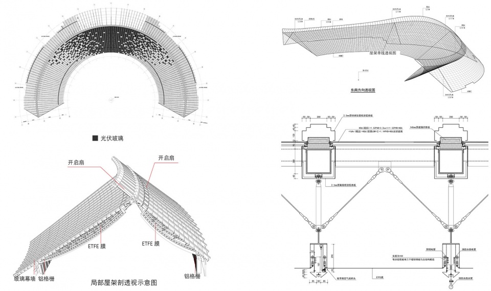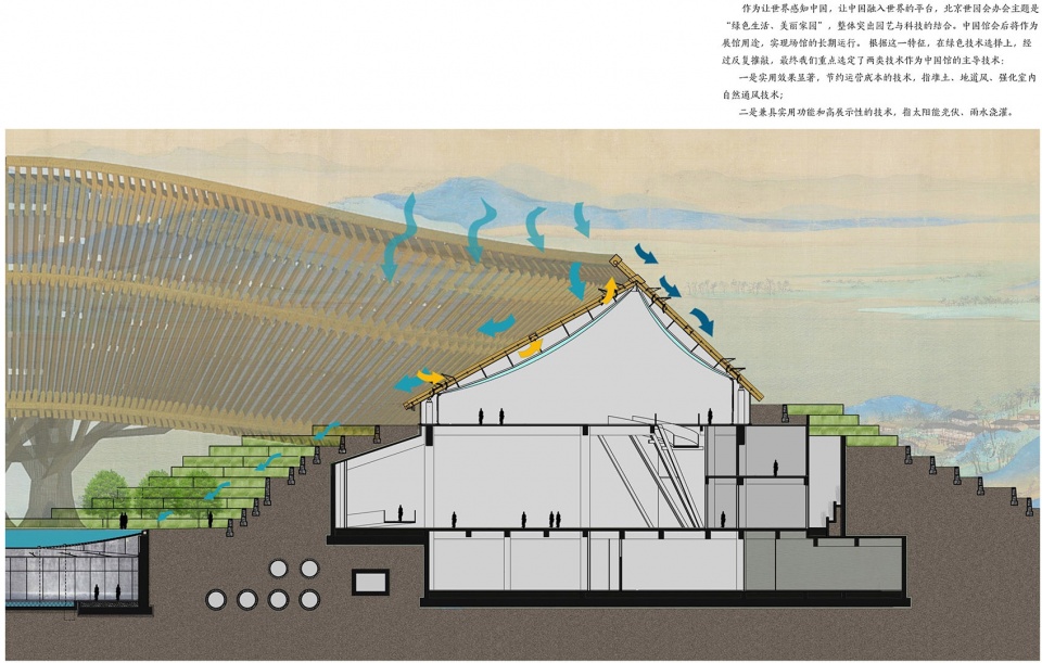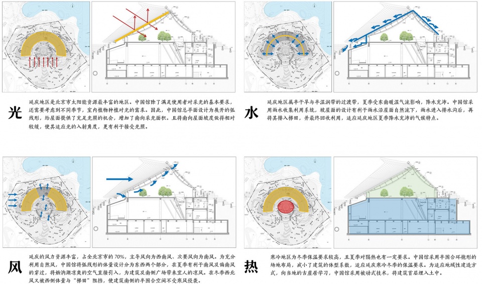 根据延庆地区光照、降水、通风、温度等气候条件,设计选择适宜的绿色技术:一是实用效果显著,节约运营成本的技术,指覆土、地道风、强化室内自然通风等;二是兼具实用功能和高展示性的技术,指光伏系统、雨水利用等。延庆地区是北京市太阳能资源最丰富的地区。中国馆除了满足使用者对采光的基本要求,还需要考虑不同季节,室内植物种植对光的需求。展开的弧线形平面可提供充足的光照机会。南向屋面坡度较缓,更有利于接受光照。中国馆采用雨水收集利用系统,坡屋面的设计有利于雨水沿屋面自然流下,雨水进入排水沟后,排入梯田,部分回收后用于梯田灌溉和水景用水。延庆的冬季较为寒冷,建筑首层展厅埋入土中,可降低围护结构的传热系数,做到被动式节能。地道风降(升)温系统通过地道(或地下埋管)与土壤进行热能交换,夏季土壤会吸收经过地道的室外空气的热量来对其冷却降温,冬季土壤对经过地道的室外空气释放热量,来达到预热的效果。设置地道风为使用频率较高的展馆提供新风,可有效降低建筑的空调使用能耗。