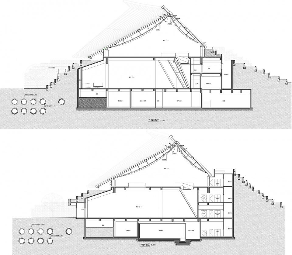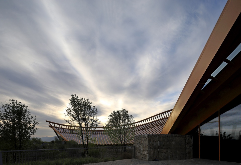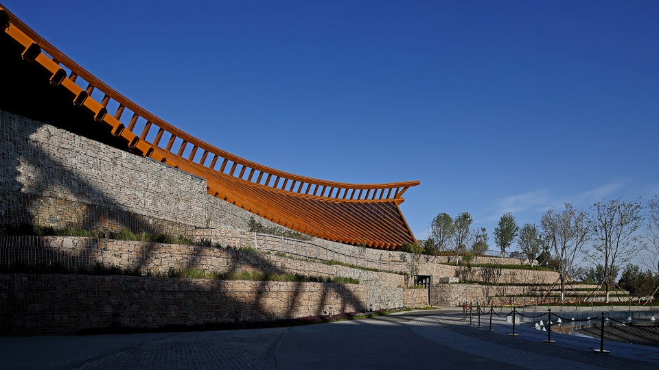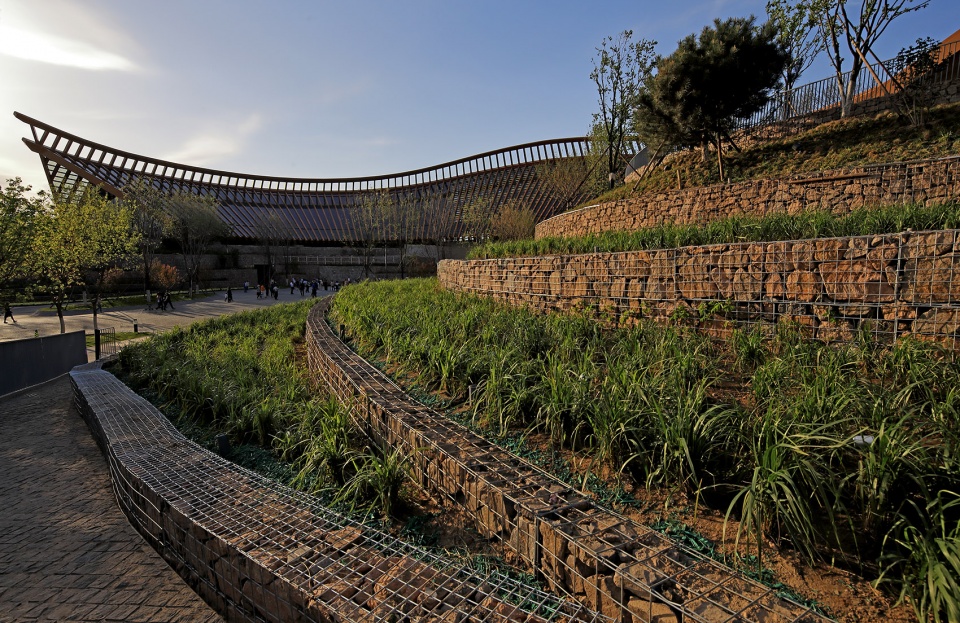 According to the climatic conditions of light, precipitation, ventilation and temperature in Yanqing, the design chooses appropriate green technology: First, it has obvious practical effects, and saving operating cost refers to covering soil, tunnel wind, strengthening indoor natural ventilation, etc. Second, the functional and high-display technology refers to photovoltaic systems, rainwater utilization, etc. Yanqing is the most abundant area of solar energy resources in Beijing. In addition to meeting the basic requirements of lighting, the Chinese Pavilion also considers the demand for light in indoor plants. The expanded arcuate plane provides plenty of light. The southward slope is gentler and more conducive to light. The Chinese Pavilion adopts a rainwater collection and utilization system. The design of the slope roof is conducive to the natural flow of rainwater along the roof. After the rainwater enters the drainage ditch, it is discharged into the terraced fields, and is partially used for terraced irrigation and waterscape use. The winter in Yanqing is relatively cold, and the first floor exhibition hall is buried in the soil, which can reduce the heat transfer coefficient of the envelope structure and achieve passive energy conservation. The tunnel windfall temperature system exchanges heat with the soil through the tunnel (or underground buried pipe). In summer, the soil absorbs the heat of the outdoor air passing through the tunnel to cool it. In winter, the soil releases heat through the outdoor air passing through the tunnel to achieve the effect of preheating. The installation of tunnel winds provides a new style for the pavilions with higher frequency of use, which can effectively reduce the energy consumption of air conditioning in the building.