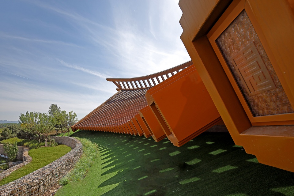 ▼绿色的梯田与红色的屋面系统相适应