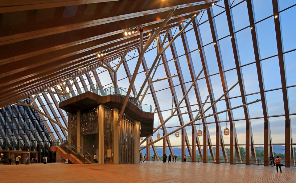 Passing through the hall and entering the west side of the exhibition hall, it is a green world. Although buried in the earth, the top lighting hole is designed to introduce natural light. The slope rises slowly and the space becomes brighter and brighter. The glass and ETFE membranes give people a feeling of openness. To the east, visitors will get through the exhibition hall to reach the central viewing platform. This is the most spacious space of the building. People can overlook Yongning Pavilion, Guirui Theater and the International Pavilion.