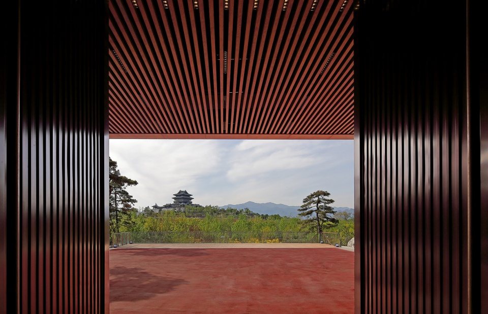 穿过序厅门洞,进入一层西侧展厅,这是一个绿意盎然的世界,尽管被埋于土中,顶部采光洞口的设计可将二层的自然光引入其中。沿坡道缓缓上升,空间变得越来越明亮,由玻璃和ETFE膜作为顶面的二层展厅,给人豁然开朗的感觉,向东穿过展厅可到达中部观景平台,这是整个建筑最宽敞开阔的空间,在此向西北,可远眺永宁阁、向东北,可看到妫汭剧场和国际馆。