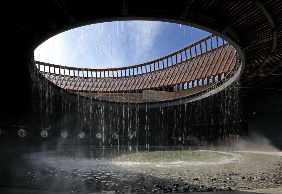 During the EXPO, visitors enter the Chinese Pavilion via the south plaza. Visitors need to walk a gentle slope of nearly 100m long and 4% slope because of the height difference between the main entrance elevation (absolute elevation is 488.30) and the south road elevation (484.40). It meets the need of accessible design and makes the visitors’ feeling comfortable. After the gentle slope, people come to the open semi-enclosed front plaza, surrounded by terraces of vegetation. At the center of the plaza is a circular water courtyard. The water in the sink overflows and falls to the basement through the tile roof to form a spectacular water curtain.