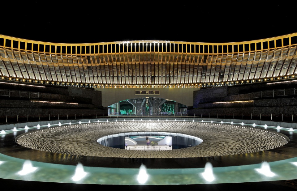 ▼中国馆主入口及圆形水院夜景