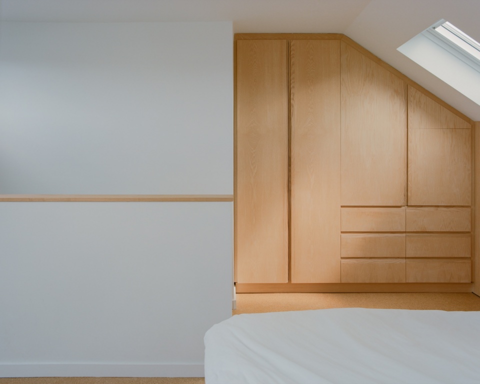 除首层扩建与翻新外,阁楼改造新增了一间卧室、一间共用卫生间以及一处居家办公空间。我们希望新的二层空间呈现出开阔、明亮且慷慨的感受,仿佛置身屋顶之上,而非像许多阁楼空间那样被压缩在屋面之下。基于这一理念,卧室设置了一扇大型竖向全景窗,将城市与天空的景致纳入视野。淋浴上方的天窗为卫生间引入充沛的自然光,同时营造出仿佛置身户外、仰望天空的体验。