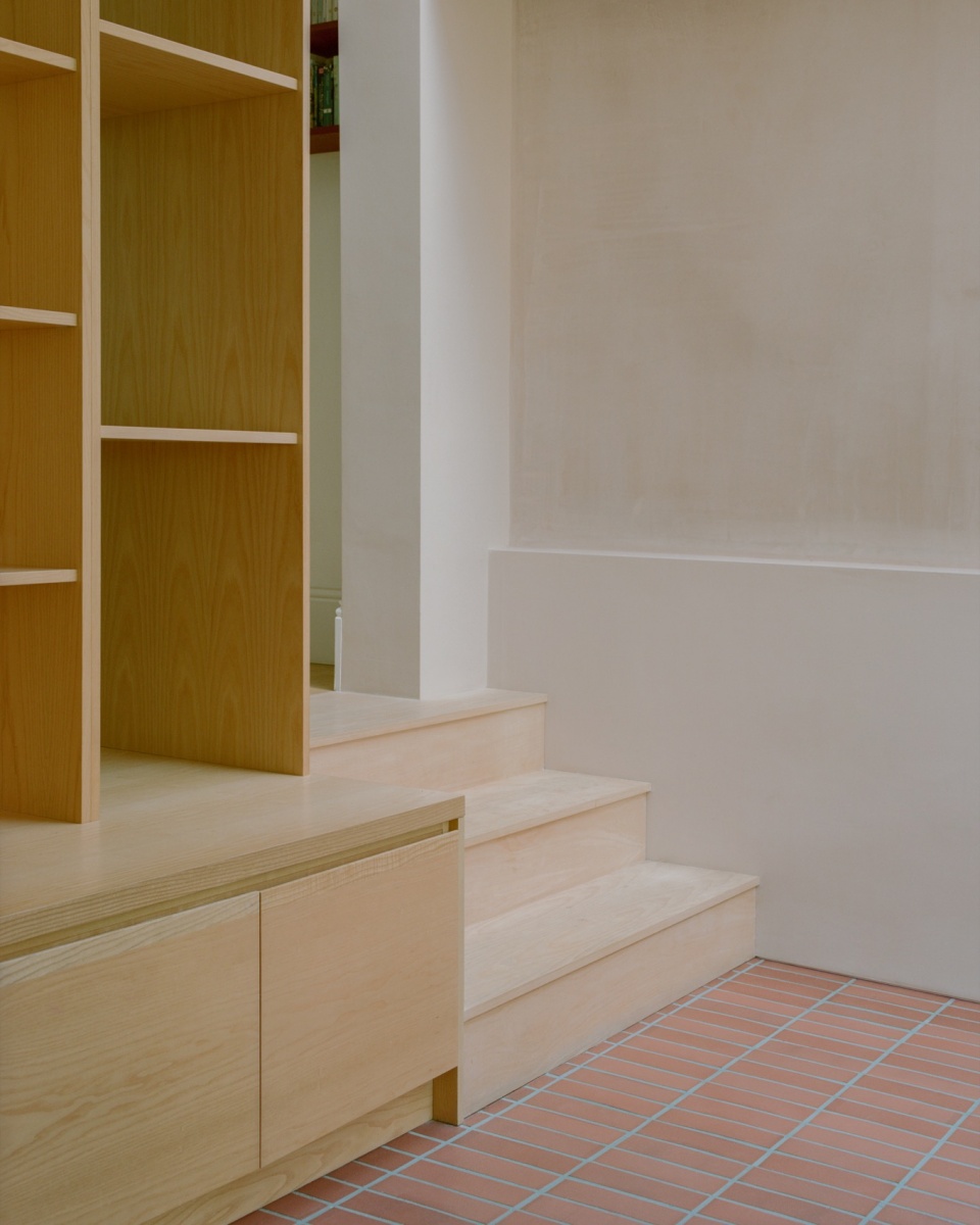 项目所采用的材料包括以细腻双色方式铺设的手工模制砖、烧制陶土地砖、软木、未上漆的抹灰表面,以及定制的白蜡木细木作。这些简洁、经济且耐用的材料——砖、陶土与木材——赋予项目鲜明的个性,同时也回应并延续了原有住宅的历史建造特征。