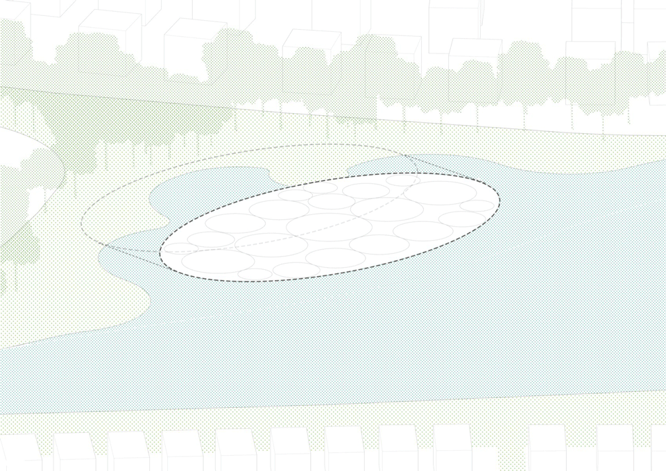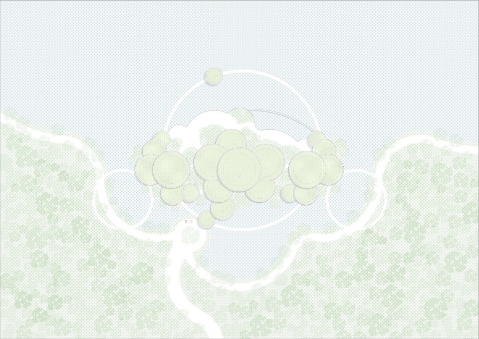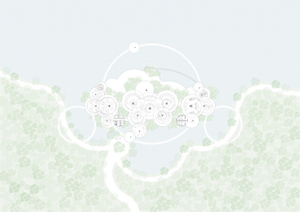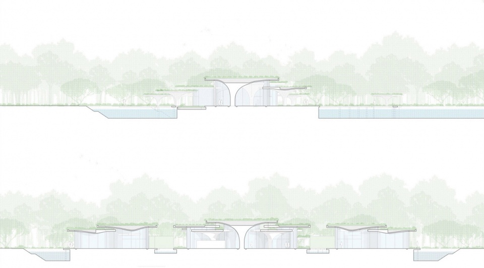 Guided by this spirit, the building is composed of multiple small volumes interwoven beneath the forest canopy across a usable area of approximately 2,000 square meters. Each functional block is positioned at varying elevations and connected through curving pathways and reflective water surfaces, forming a spatial journey that shifts continuously between openness and stillness, brightness and shade. Moving through the clubhouse feels like strolling through nature itself: energetic zones such as the restaurant and children’s play area open widely toward the lake, while quieter areas like the spa, lounge, and meditation spaces retreat into shaded pockets of greenery. With its dispersed layout, the building nearly disappears when seen from afar, minimizing visual impact while enriching the sensory experience, where light, wind, and water subtly guide each step.