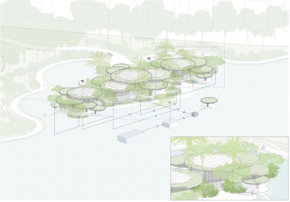 The project’s sustainable character is expressed most clearly through its multi-layered green roofs, one of its defining design features. Three main roof clusters composed of circular forms at varying heights create a soft, undulating topography that blends naturally into the surrounding forest canopy. The roofs are entirely covered with native plant species, forming a self-sustaining micro-ecosystem. This living layer reduces heat absorption, enhances natural cooling, provides habitat for birds and small wildlife, and filters rainwater before returning it to the lake. The roof profile gently lowers at the edges and rises toward the center, allowing daylight to be moderated throughout the day, reducing direct solar radiation and maintaining a cool microclimate. Through this approach, tropical adaptive architecture is expressed naturally, with form, ecology, and function operating in the same rhythm.