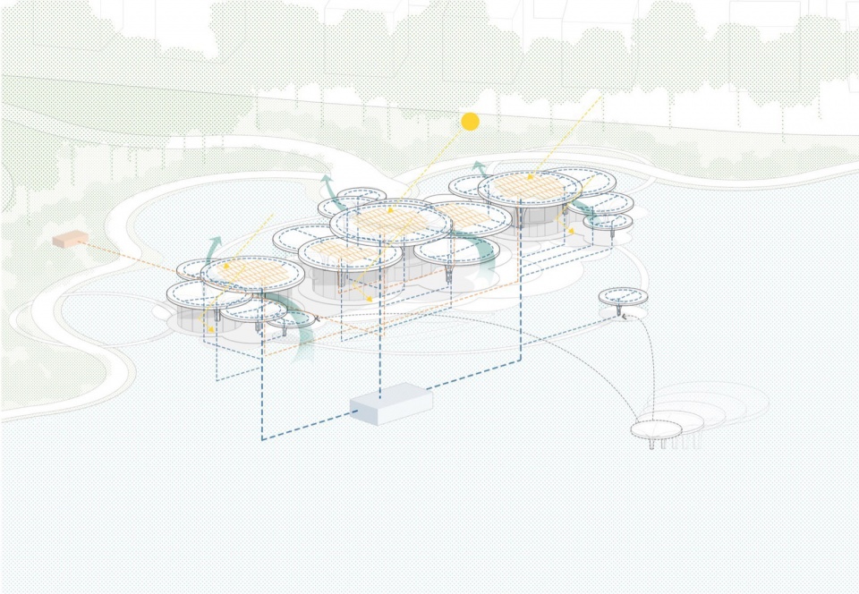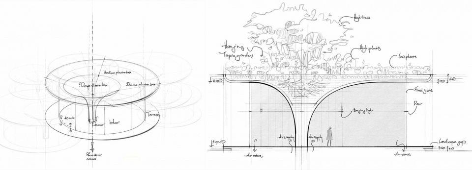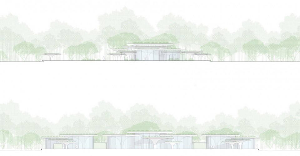 项目的可持续特质最集中地体现在其多层次的绿色屋顶系统上,这也是建筑最具辨识度的设计特征之一。由三组不同高度的圆形屋顶构成的整体屋面,形成起伏柔和的“人工地形”,自然融入周围的林冠景观。屋顶完全覆以本土植物,构建起一个可自我维持的微型生态系统:既降低热量吸收、提升自然通风与降温效果,也为鸟类与小型动物提供栖息空间,同时在雨水回流湖泊之前进行自然过滤。屋顶边缘缓缓下压、中央略微抬升,使自然光在一天之中被柔化与调节,减少直射辐射,营造出凉爽而稳定的微气候。通过这一策略,热带适应性建筑不再是一种形式化表达,而是让形态、生态与功能在同一节奏中自然运作。