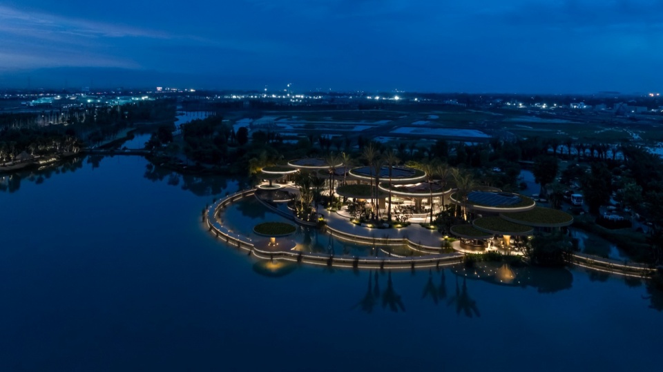 从水面望去,莲花会所轻柔地停驻在地景之上,宛如漂浮其间。建筑与湖泊的直接关系,使人能够真切感知水面、光线与地平线之间的微妙互动。7.2米的建筑高度经过精确控制,在与周边别墅尺度保持和谐的同时,确保场地范围内的视线通透与景观完整。设计所传达的态度十分明确:建筑的身份并非来自视觉奇观,而源于克制、精致与对场所的敏感回应。这是一种当代度假建筑的表达方式,在室内与室外、人造与自然、光明与阴影之间,建立起柔和而流动的过渡。