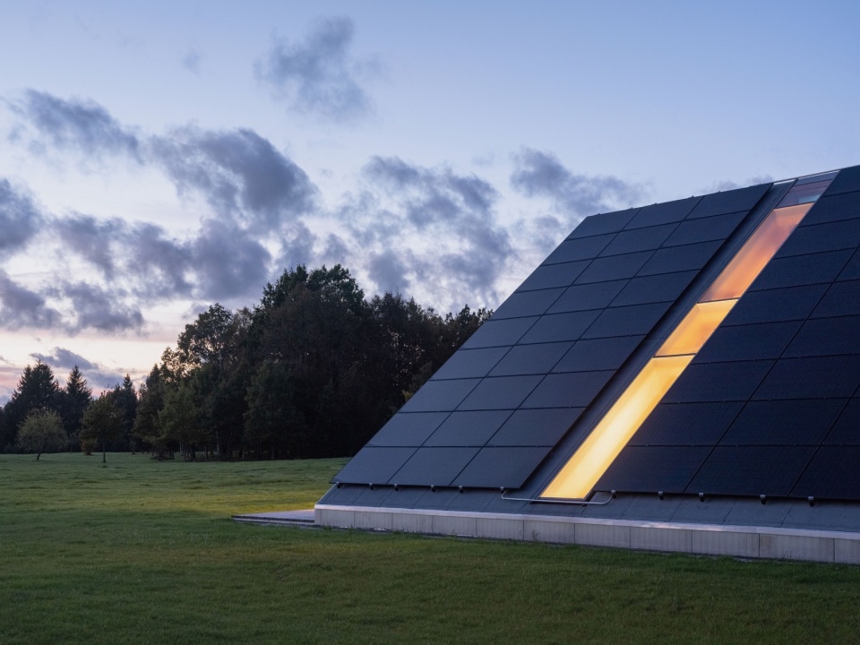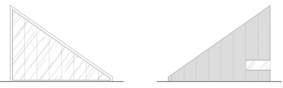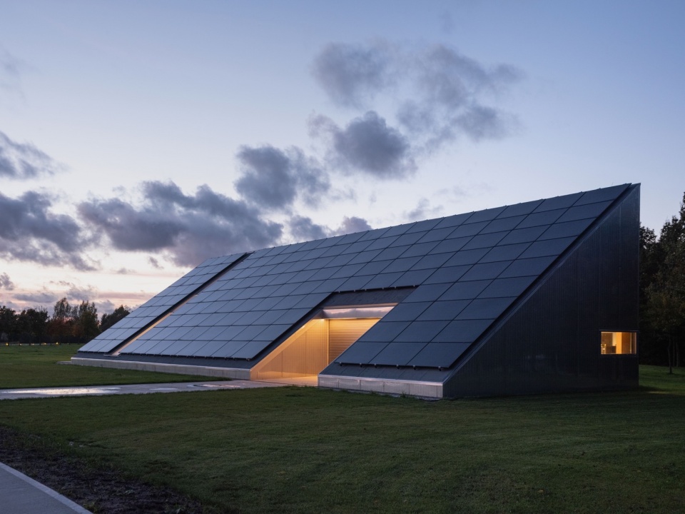 从外观上看,建筑依然保持着克制而封闭的姿态。单坡、楔形的体量被统一包覆于不锈钢色的夹芯板“外壳”之中,宛如一座坚固的建筑容器:耐久、低维护,守护着内部丰富而多重的生活场景。35 度的屋顶坡度不仅塑造了富有动感的轮廓,也为未来实现能源自给(如太阳能利用)预留了可能。