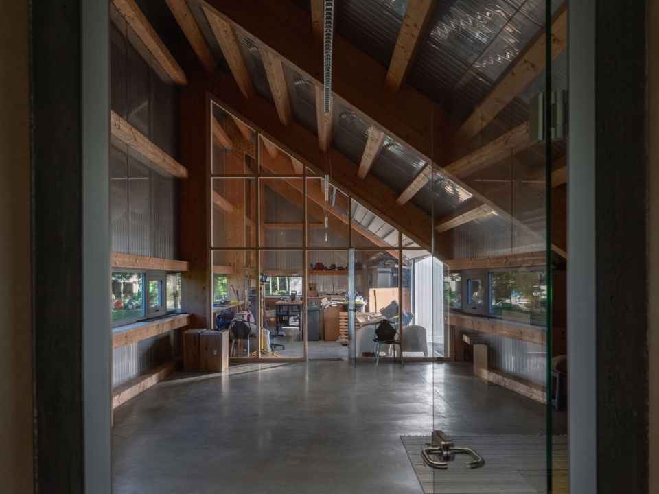 However, the western part of the building is designed on a human scale. Here, a separate entrance leads to areas that transcend the concept of a typical warehouse. The designed auxiliary rooms and the mezzanine floor create a truly universal space. Thanks to high-quality engineering solutions and an abundance of natural light, this zone can transform instantly: during the day, it can serve as a workspace or workshop, and when needed, it becomes a fully-fledged living area for guests, offering accommodation with a view of nature.