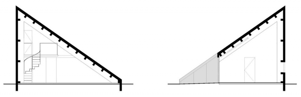 若建筑不仅服务于物件,也服务于人,自然采光便至关重要。西立面的大面积玻璃窗将日落景象框入室内;而最引人注目的设计元素,则是由屋顶天窗延伸至北立面的竖向开窗,使光线能够深入建筑内部,即便最深处的空间也能获得自然照明。这一设计让夹层不再像传统阁楼,而更接近一处开阔的“观景室”。