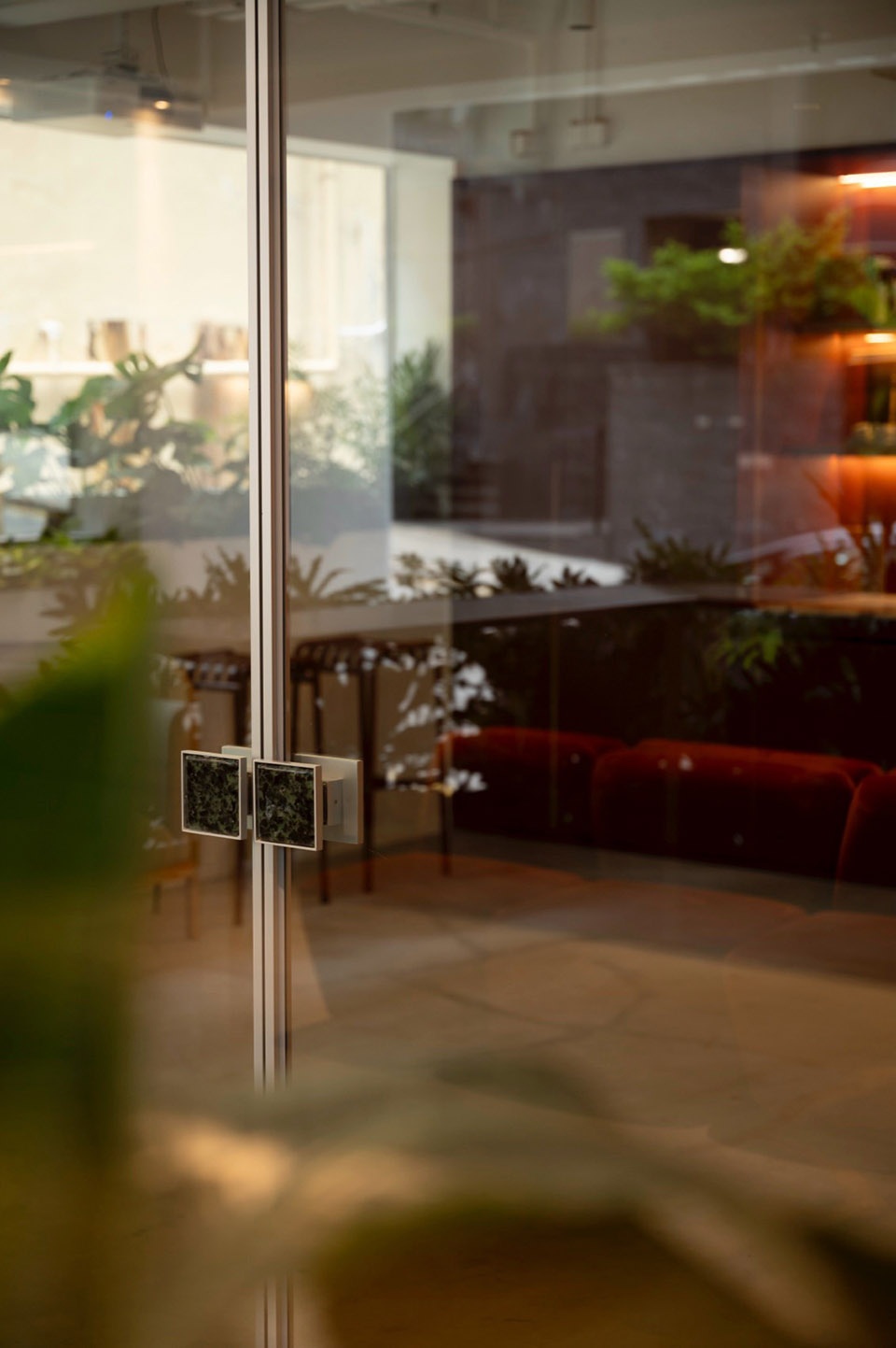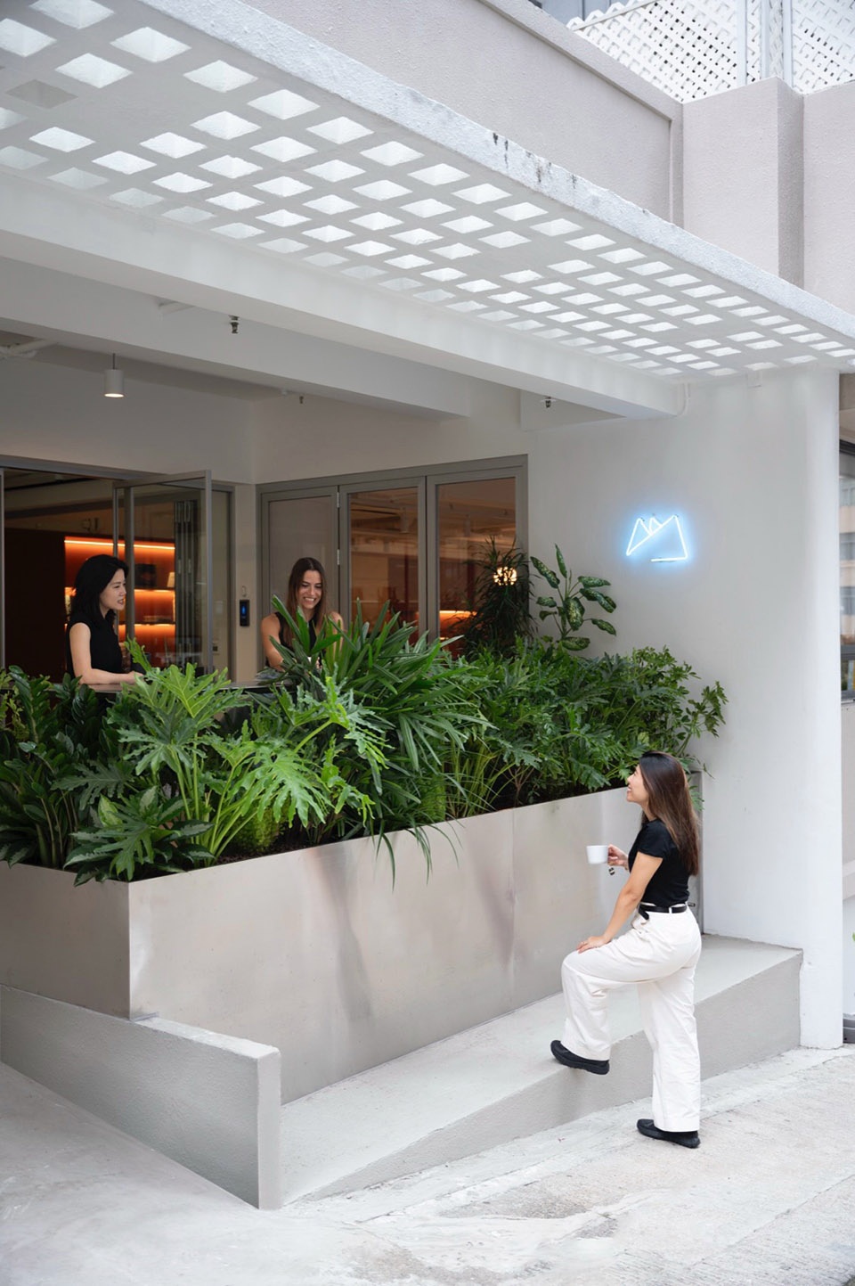 ▼临街的大面积窗面与绿意盎然的室外入口区域,expansive street-facing windows and a verdant outdoor entrance