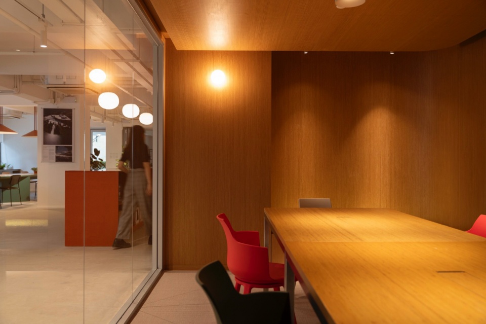 开放与参与是Snøhetta香港新工作室的核心特质。工作室与城市充满活力的街道界面形成积极互动。临街的大面积窗面与绿意盎然的室外入口区域向社区敞开,建立起与周边邻里的直接联系。室内的接待区域同时作为灵活的公共活动空间,支持讲座、工作坊、展览及快闪活动等多种形式,为香港创意产业提供交流平台。通过可移动隔断与可变家具配置,该空间能够灵活转换,满足不同协作需求。