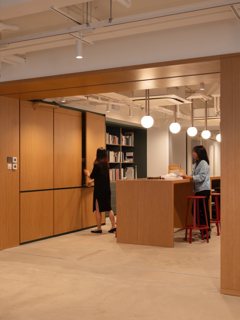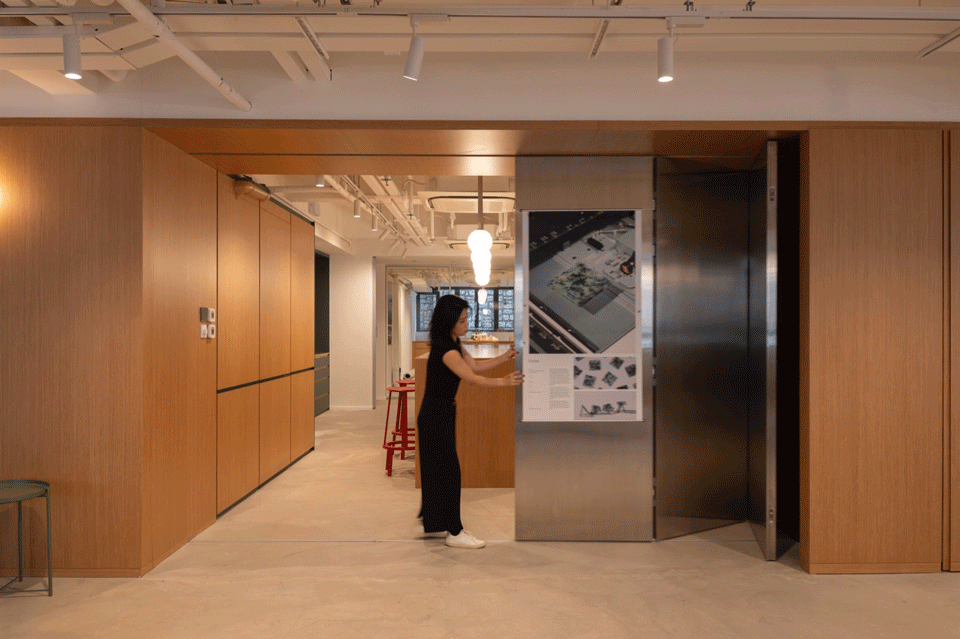 Openness and engagement lie at the heart of Snøhetta’s newly expanded Hong Kong studio. The studio creates a dynamic interface with the city’s energetic urban fabric. Expansive street-facing windows and a verdant outdoor entrance area welcome the community into the studio, establishing a direct connection to the neighborhood. Inside, a welcoming reception area will double as a flexible venue for community programming – supporting Hong Kong’s creative industries through talks, workshops, exhibitions, and pop-up events. Outfitted with retractable partitions and adaptable furnishings, the area transforms with ease to accommodate a range of collaborative activities.