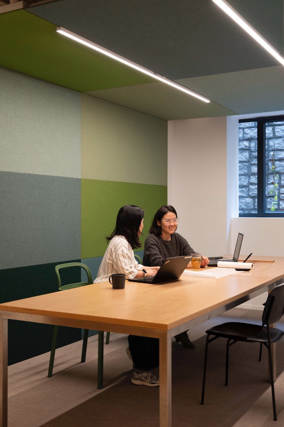 Adjacent to this is a long communal table, a signature element of Snøhetta’s global studios. Framed by greenery, it serves as the social heart of the studio – a space for shared meals, informal conversations, and spontaneous collaboration.