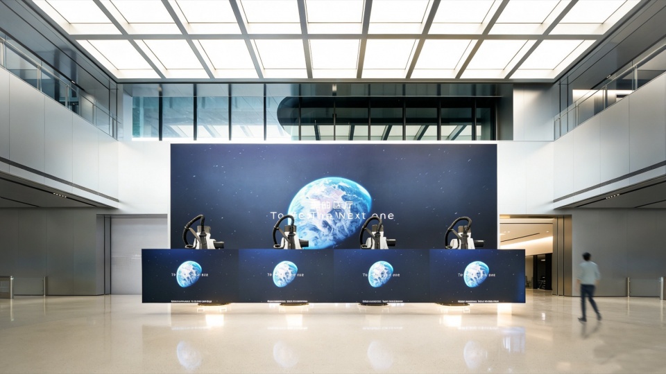 为助力美的集团实现从 “传统白色家电企业” 到 “头部科技企业” 的品牌形象升级,杰恩设计在室内设计层面倾注匠心,打造专属品牌气质的空间表达。以大堂区域为例,高挑的空间搭配简练的线条,结合精巧的灯光设计与超大尺寸显示屏,塑造出极具视觉冲击力的科技感空间。材料选用上,采用阳极氧化铝板、人造石、素色岩板与裸顶等材质,兼具优质质感与耐用性,进一步强化空间的科技美学质感。以黑白灰为主的科技感色调,营造出简洁大气、极具现代感的空间氛围。