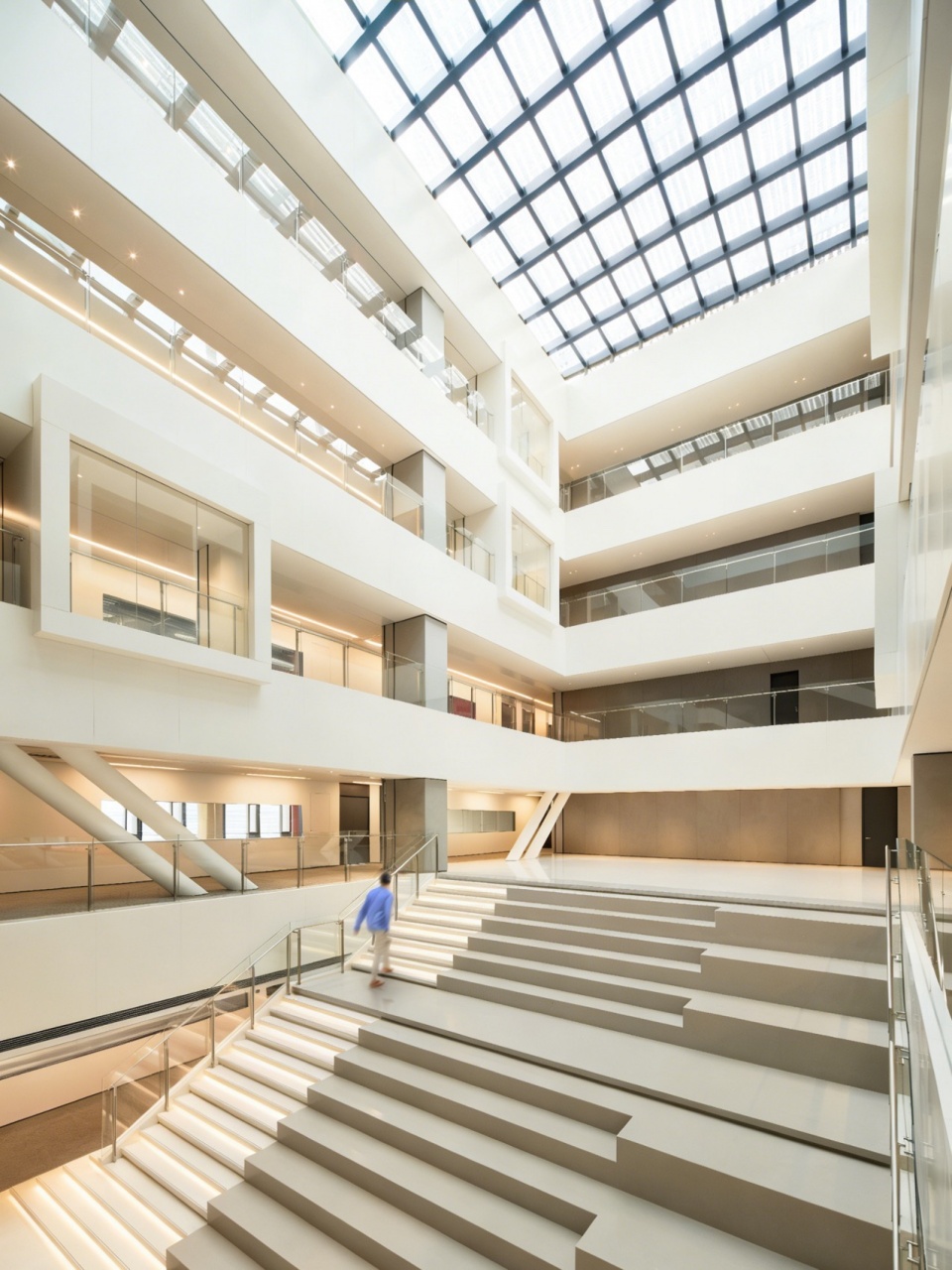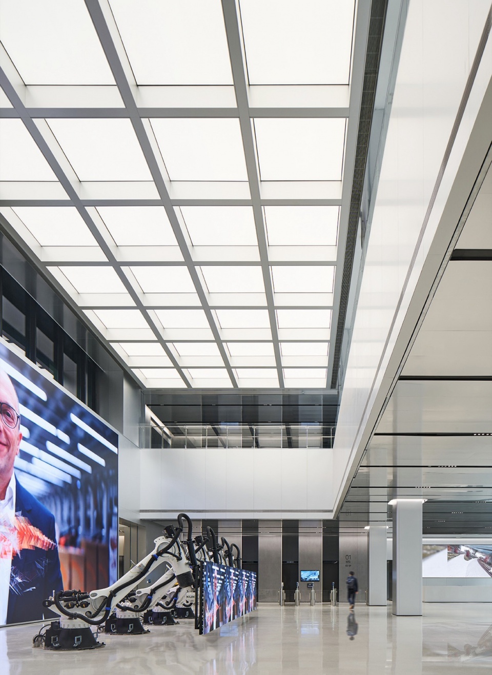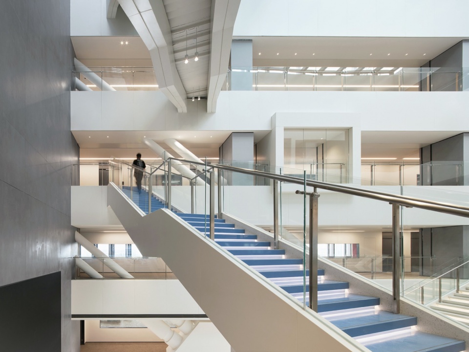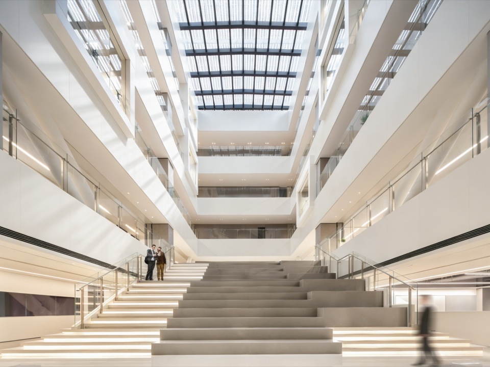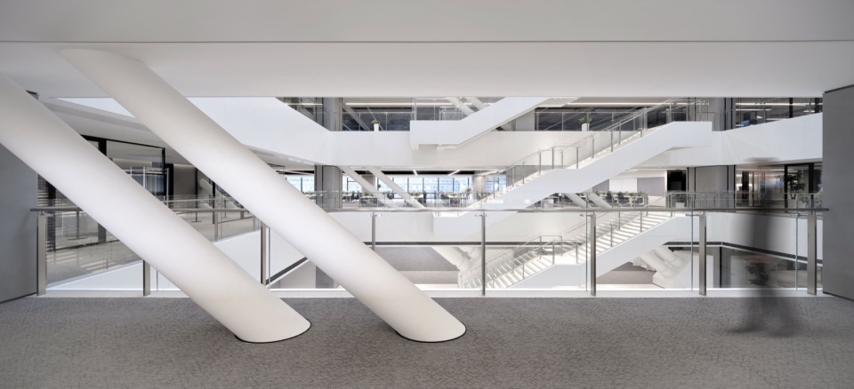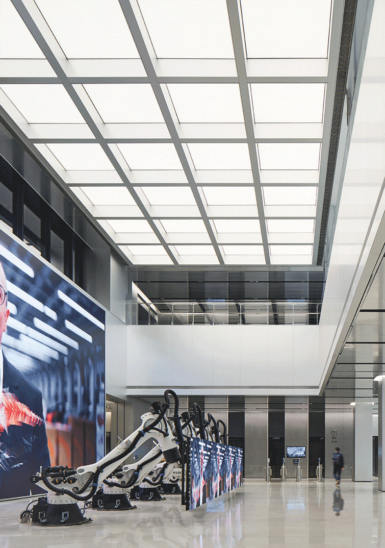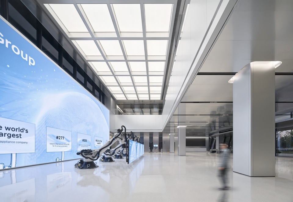 J&A 杰恩设计以室内、灯光、标识、机电等多专业一体化的模式,打造上海美的全球创新园区,在设计过程中面临诸多极具难度的挑战:—— 摒弃传统垂直塔楼的竖向功能布局,在这座横向摩天楼中,整合容纳库卡机器人、美的医疗、美的能源等前沿业务板块,以及办公、实验、路演等复合功能。