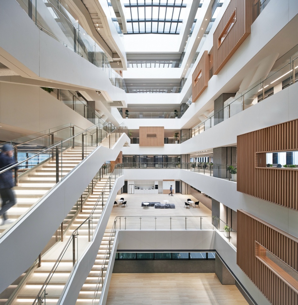 多样化的中庭为员工营造了丰富的活动场景,既可用作日常研讨、交流的互动空间,也可承办培训、团建等各类活动。各中庭拥有差异化的互动设计,通过打造特色场景、艺术装置与阶梯空间,激发员工的创新思维,同时成为园区立体交通系统的关键节点。