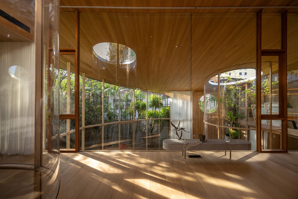 跨越门槛,空间豁然展开,进入住宅的核心——中央庭院。建筑在保留场地原有树木的前提下,将自然包裹其中,如同一只玻璃陈列柜般环绕生长,形成一个被保护的生态箱。这片绿色核心作为被动采光源,主导着日常的光影表演:阳光透过枝叶洒落,在木质内饰上投射出不断变化的阴影。随着太阳角度的变化,住宅的氛围随之呼吸与转化,每一个时刻都呈现出不同的空间情绪。