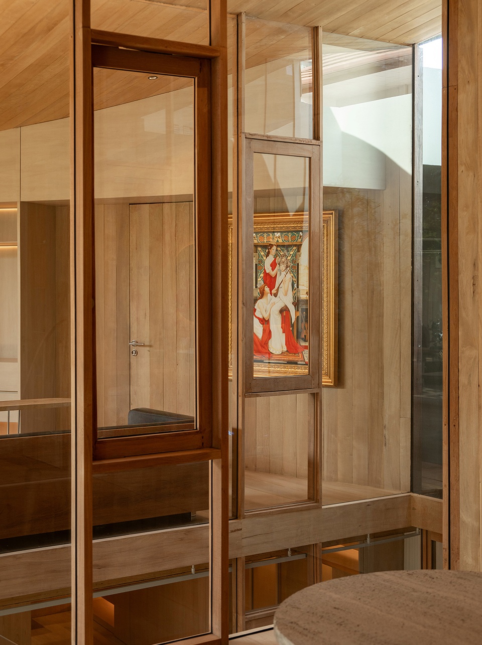 Crossing the threshold, the space expands into the home’s beating heart: the Central Courtyard. Preserving the site’s original trees, the house wraps around nature like a glass vitrine—a “Terrarium” where life flourishes protected. This green core functions as a passive light source, orchestrating a daily performance where sunlight filters through leaves, painting shifting shadows upon the wooden interiors. The atmosphere of the house breathes and transforms with the sun’s angle, creating a different mood for every hour of the day.