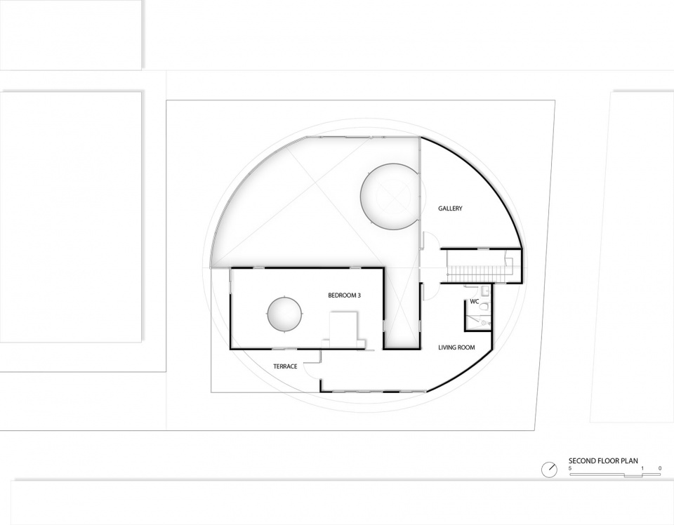 尽管四周被邻里包围,室内却呈现出近乎无界的感受。双层挑空的起居空间赋予垂直方向的自由,弧形玻璃墙体消解了空间的转角,使客厅、工作区与上层空间之间形成视觉上的连续流动。二层作为私密的顶层居所,安置艺术收藏与主卧空间,并始终与中央中庭保持着持续的对话关系。