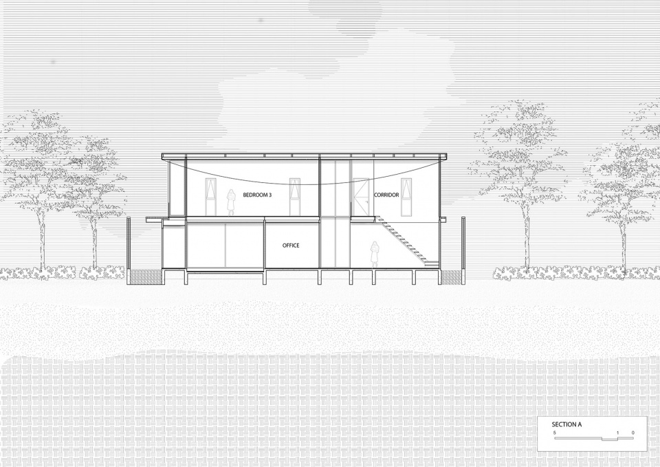 使生态匣居脱颖而出的,是其富有灵魂的材料表达。作为一位资深承包商的自宅,这座住宅本身即是一份关于工艺的宣言。设计精心挑选了七种不同树种,并通过化学漂白处理,使其呈现出接近日本桧木(Hinoki)的统一色调。这种视觉上的柔和掩藏着结构上的智慧:住宅采用无柱结构,由钢结构与铁坚木(Takhian wood)玻璃框架共同承重铝制屋顶。这是一场对材料真实性的颂扬,让结构与肌理以最诚实、也最美的状态被呈现出来。