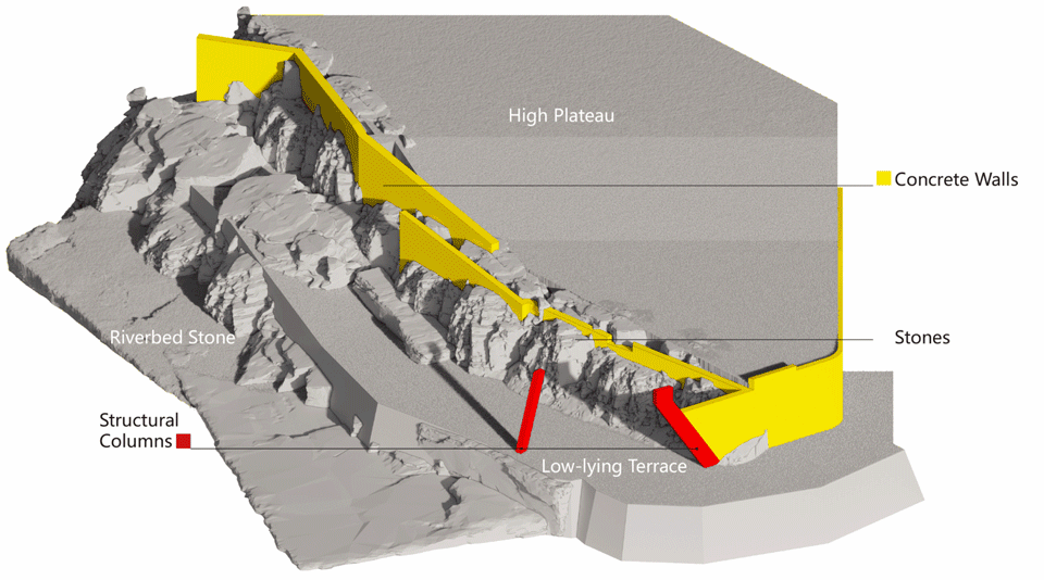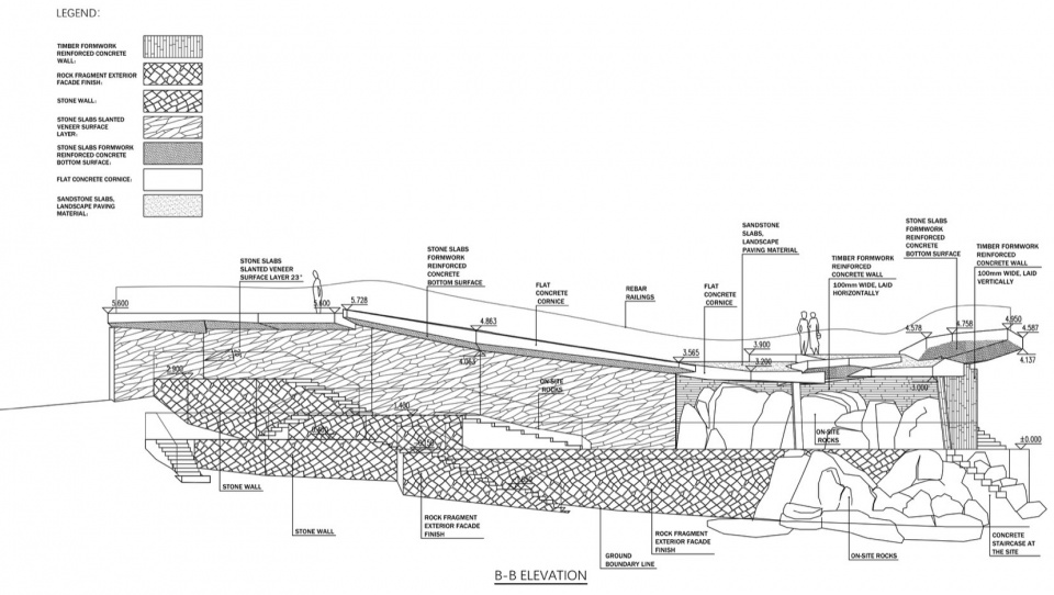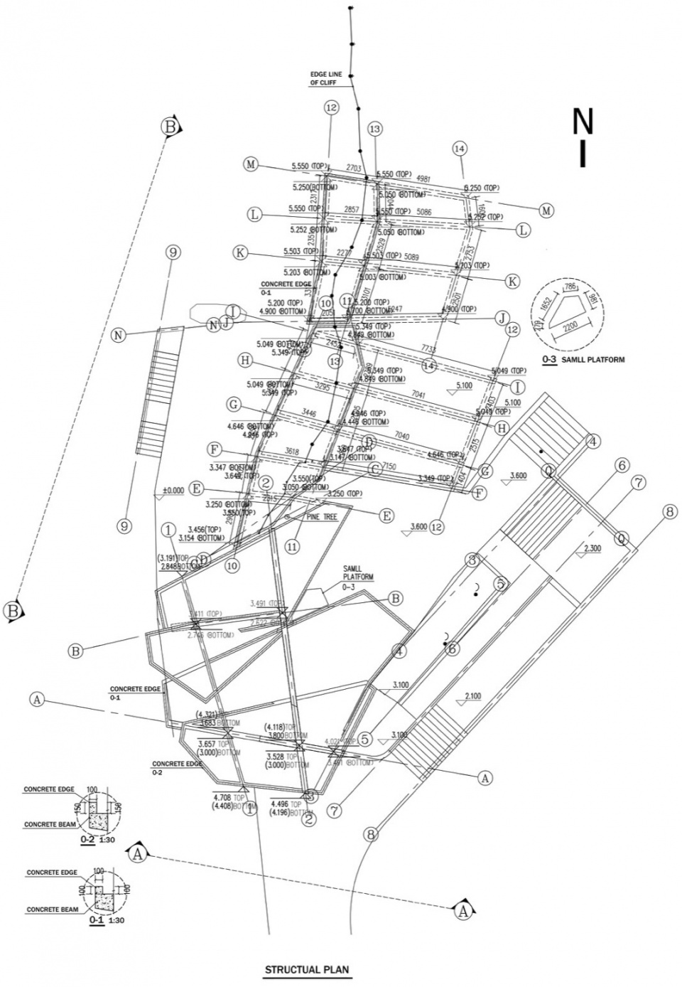At the technical level, however, the structure is the result of careful calculation and deliberate expression. The platform is supported by a stable reinforced-concrete frame system. One side rests on a wall founded directly on native rock, while the opposite side is supported by two inclined columns. One of these columns is concealed within the wall, extending outward from its base to support the upper frame beam. This structural strategy reduces construction costs and avoids the technical challenges associated with excessive cantilevering from the upper platform.