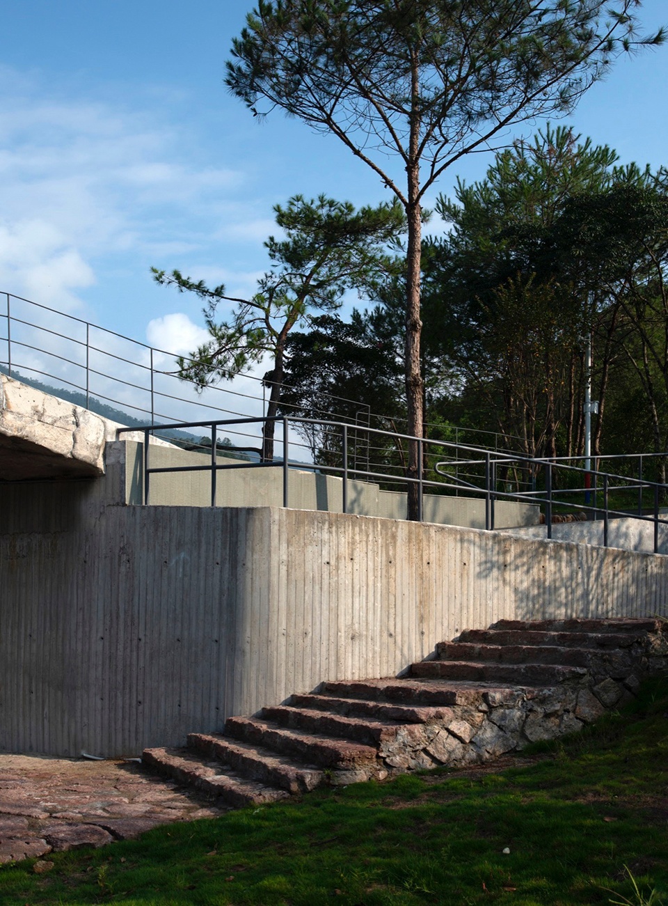 那颗被凸显出来的单柱表面未作任何修饰,它在及其明显的位置以及其人工的方式出现,而它的周围是纯粹的自然,或者是已经成为自然的人工构筑。这颗柱子就像是一处签名,一处建筑师和结构工程师的签名,或者是一处建造它的人工技术的签名。它是为自然勾画并强调的下划线,引发关于自然与人的关系的哲思。