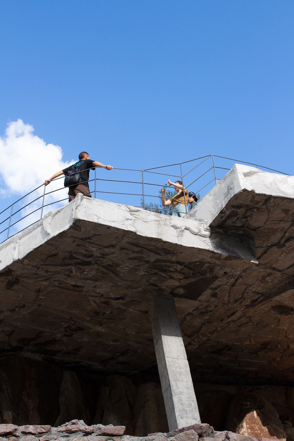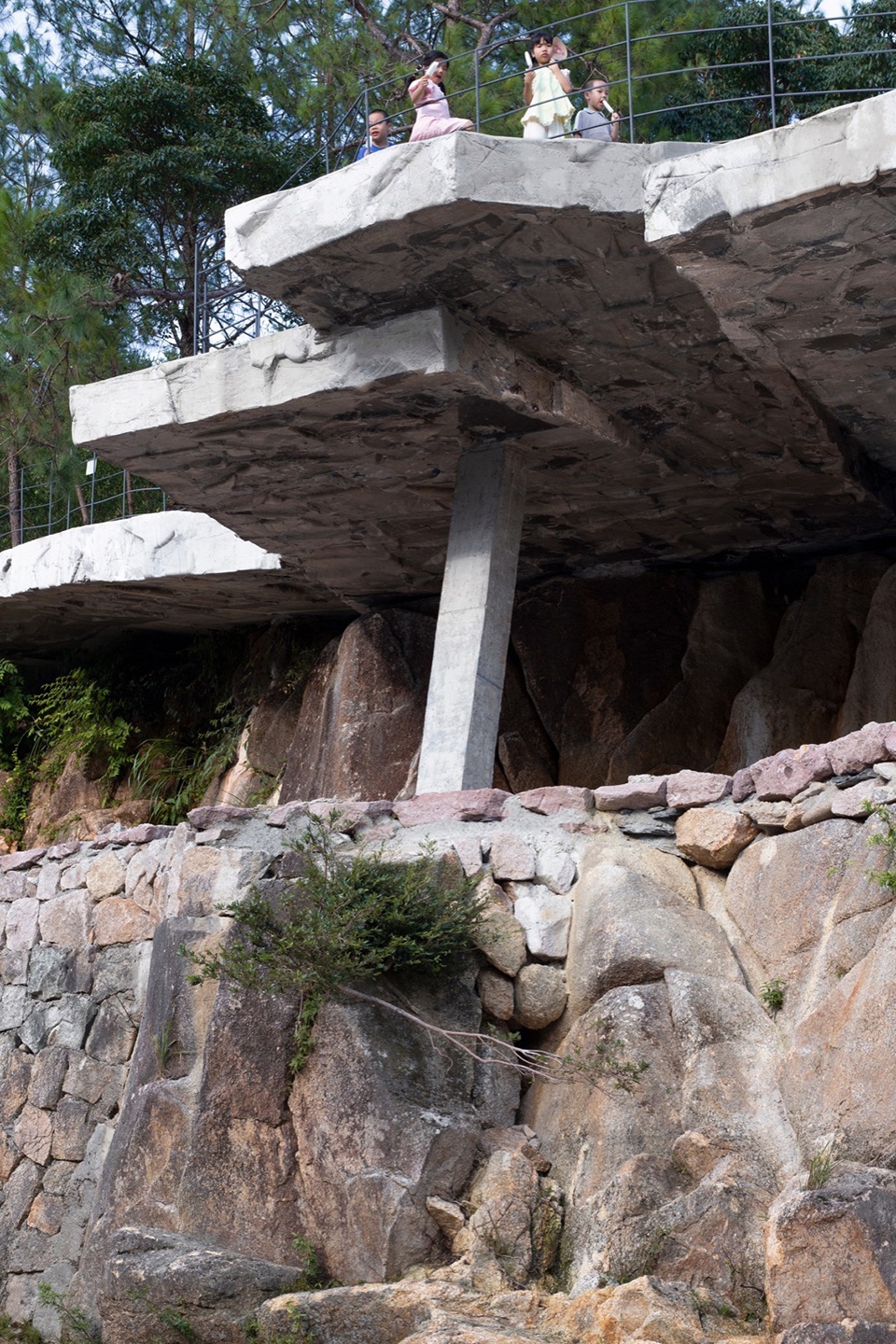 建造完成的观景平台为体验者留下一个谜题,在下层平台显眼的位置,可以看到仅有一根纤细的混凝土柱子斜向支撑着四块相互插入的人工“巨石”。力量被汇聚在这根柱子传递至地面,但同时也引起某种感知层面的紧张:如此巨石何以被单柱支撑?这种感知同样也在提示自然力量的强大与野性。