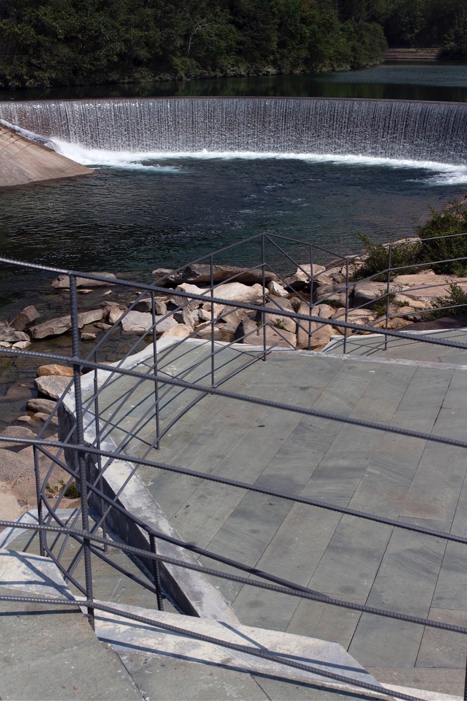 月亮湾瀑布是一处建造于1979年的人工大坝,用于调节保护区内的水文资源。它形如弯月,月亮湾因此而得名。经历近半个世纪人工和自然的相互影响,月亮湾瀑布已经完全溶于自然。瀑布的上游是一处安静的小湖面,而下游,经历了瀑布的冲洗,两岸露出了巨大的天然河石,和人工大坝一起共同构成了一处现象学意义上的场所:虽然它匍匐在大地上,但它却是这个场域连接天与山的中心。在建筑师进入这个场所的时候,一个显而易见的感受油然而生:在纯粹自然之中创造的人工空间,似乎不是生硬的“闯入”,而是隐匿在自然背后,但为自然轻轻的画上一条下划线,让自然凸显。月亮湾瀑布便是这条在阅读自然的时候勾勒的“下划线”。