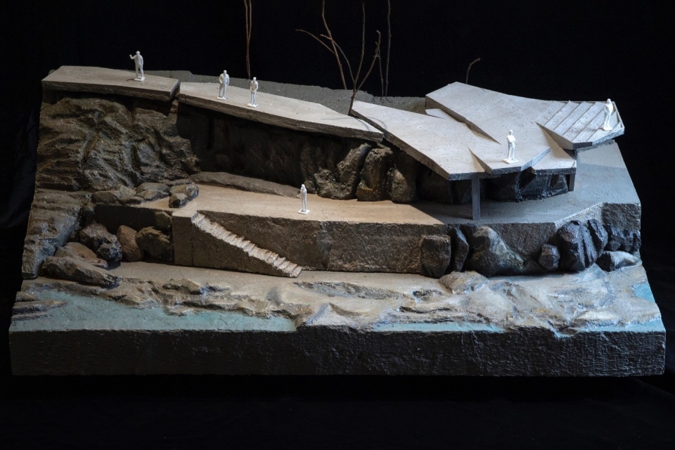 A secondary route descends from the side of the stepped “boulder” to the lower terrace. Designed primarily for canyoning and stream-tracing groups, this lower platform also constitutes the climax of the architectural experience. On the one hand, it brings visitors closer to the waterfall and riverbed, where the textures carved by water erosion are within arm’s reach. On the other, the cantilevered form creates a distinct sense of enclosure (Norberg-Schulz), evoking a cave-like space that draws human perception—amidst pure nature—back toward a primordial spatial experience.